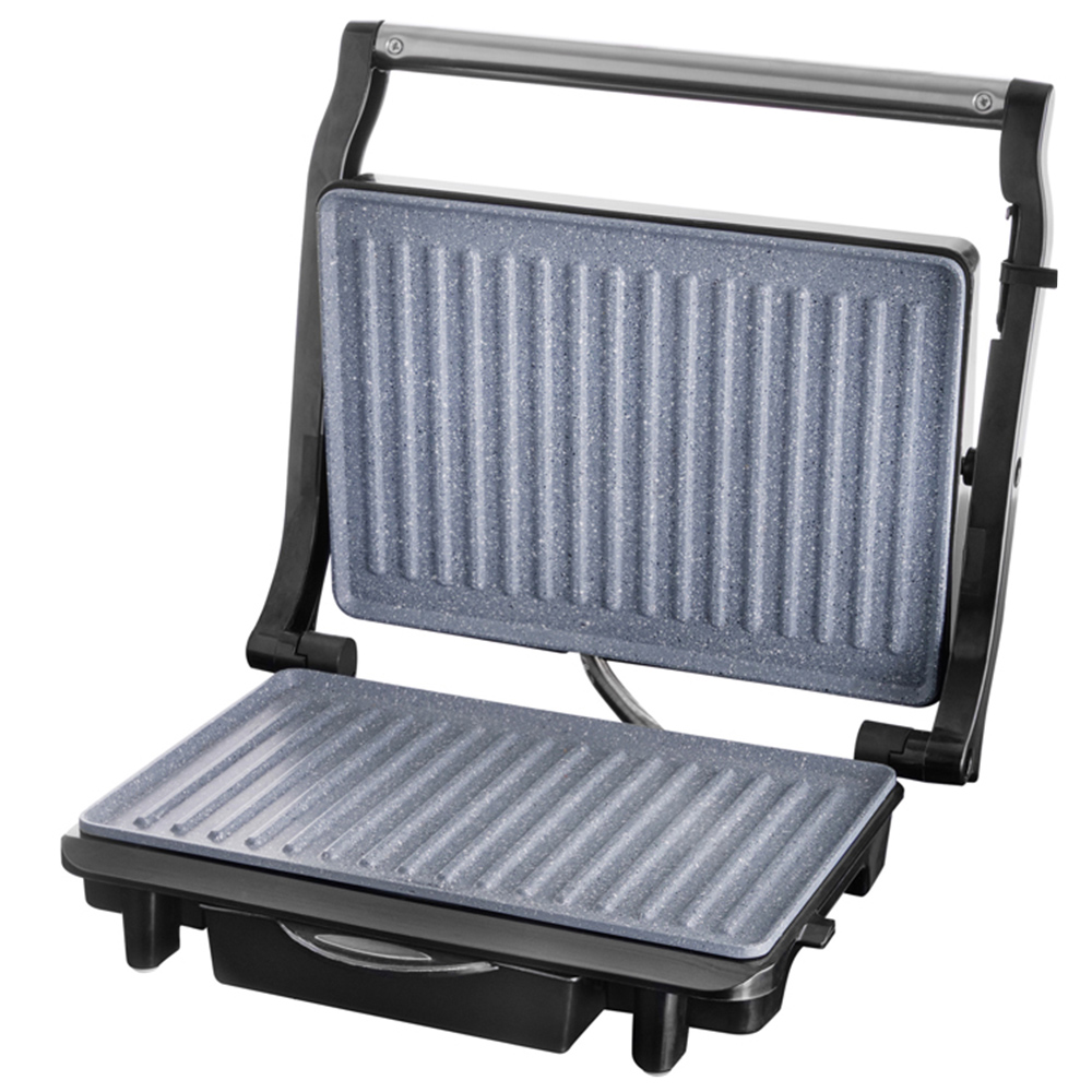 Enjoy easy cooking with the Quest Black and Silver Marble Coated Health Grill and Panini Press. This grill features non-stick, marble-finished cooking plates and a hinged lid for healthy and versatile cooking. With temperatures up to 240°C, use this healthy grill for cooking thicker cuts of meat, fish, steaks, vegetables and filled sandwiches and paninis. Also, there is no need to use oil for cooking as the plates alone will cook the food. The automatic temperature control will allow you to achieve the perfect level of cooking, depending on your choice of food. Its red-light indicator lets you know when your food is ready. Plus, the non-stick marble-coated plates make the grill easy to keep clean. The floating hinge system means that the top and bottom plates are heated so the lid can float above thicker food types to ensure your food is evenly cooked. The grill even has a handy drip tray to collect excess oils and fat. A cool touch handle and non-slip feet will ensure your comfort and safety when the grill is in use. Lastly, the grill locks shut and has a cord wrap for compact storage.