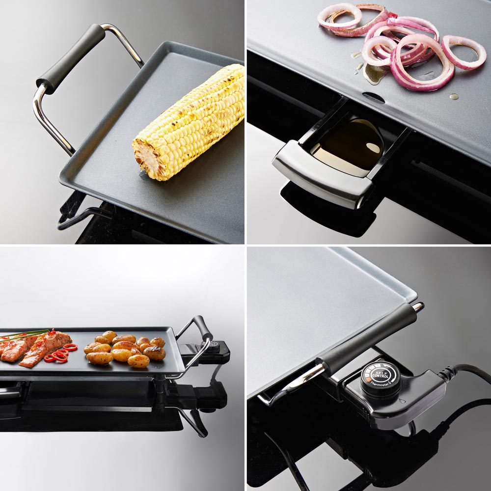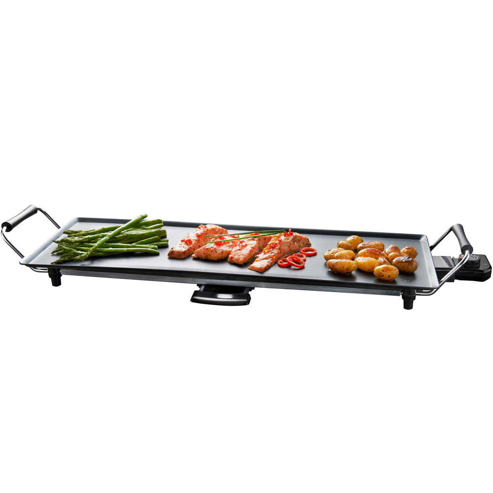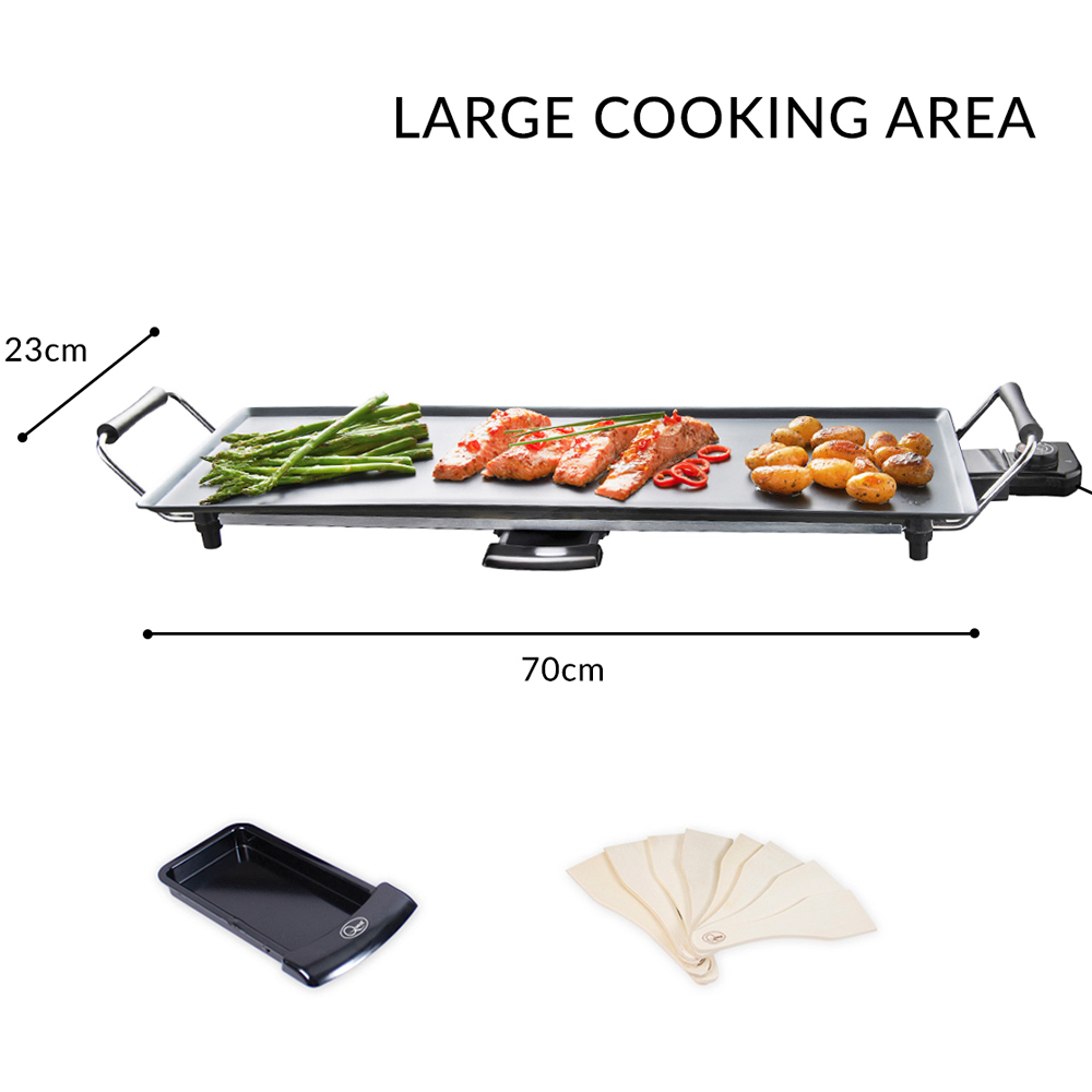 Enjoy BBQs and grills with the Quest Black Non-Stick Electric Teppanyaki Grill. This 1800-watt teppanyaki grill provides a unique home cooking experience, allowing you and your guests to cook your own food at your tabletop and dine at your leisure. Perfect for parties, barbecues, camping or caravanning, the portable grill comes with a drip tray and eight spatulas for convenient use. You can create delicious, nutritious meals with minimal fuss as the large, non-stick surface requires very little oil for cooking, and the grill is quick and easy to clean up. Also, the drip tray catches any excess fat or oil, and the adjustable thermostat function gives you complete control of grilling your food to the individual's specifications. Featuring a detachable cord, it is easy to bring to the table when ready to serve and the grill also features a cool touch handle and anti-slip feet for your safety. Plus, the grill plate gives you plenty of room for all your cooking ingredients. Use this appliance and cook foods such as meat, veg and eggs on its flat surface which browns food on the outside while keeping it juicy and full of flavour on the inside. Size: Large.