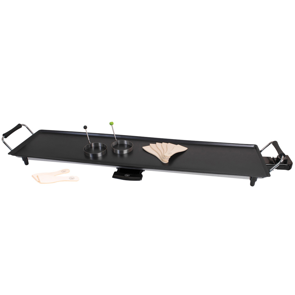 Enjoy BBQs and grills with the Quest Black Non-Stick Electric Teppanyaki Grill. This 1800-watt teppanyaki grill provides a unique home cooking experience, allowing you and your guests to cook your own food at your tabletop and dine at your leisure. Perfect for parties, barbecues, camping or caravanning, the portable grill comes with a drip tray and eight spatulas for convenient use. You can create delicious, nutritious meals with minimal fuss as the large, non-stick surface requires very little oil for cooking, and the grill is quick and easy to clean up. Also, the drip tray catches any excess fat or oil, and the adjustable thermostat function gives you complete control of grilling your food to the individual's specifications. Featuring a detachable cord, it is easy to bring to the table when ready to serve and the grill also features a cool touch handle and anti-slip feet for your safety. Plus, the grill plate gives you plenty of room for all your cooking ingredients. Use this appliance and cook foods such as meat, veg and eggs on its flat surface which browns food on the outside while keeping it juicy and full of flavour on the inside. Size: Extra Large.