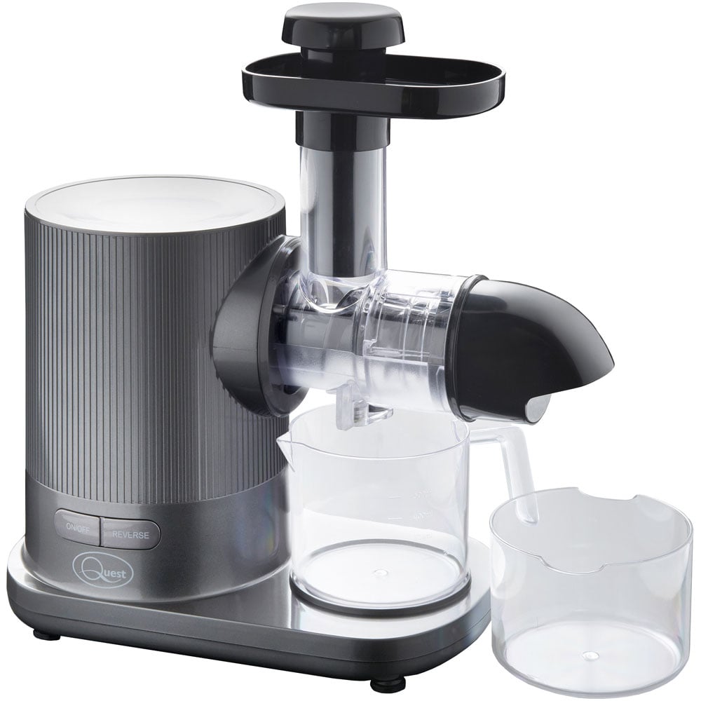 Enjoy freshly pressed juice with this Quest Grey Slow Masticating Juicer. This innovative cold press juicer takes a slower and calmer approach to juice, focusing on squeezing the juice out of an ingredient to ensure higher quality, smoother juice. The masticating juicer technology smartly focuses on using high pressure to juice, resulting in less air and foam in the juice, making it more pleasant to drink and preserving it for a longer time. If you want your juice to be as healthy as possible, the masticating juicing process results in juice with higher levels of vitamins and minerals than a centrifuge. Packed with features, this makes a slow juicer perfect for those focusing on health and fitness. Easy and safe to clean, with many of its parts being dishwasher safe, and a cleaning brush being included maintaining the appliance is quite simple. Also, even though it’s called a ‘slow juicer’, don’t be fooled - this juicer can still make a glass of orange juice in just 30 seconds. Its 85rpm speed will steadily squeeze every last drop out, ensuring that you’ll have a drink in no time. This juicer is much quieter than traditional juicers, operating at a noise level of below 60dB, quiet enough that you can easily have a normal conversation over the sound of the motor. Plus, the juicer creates delicious drinks from a wide variety of fruits and vegetables, including oranges, lemons, citrus fruits and more. Its sleek, modern design comes with two beakers that are easy to pour from and a large feed tube of 42mm diameter. For added convenience, it includes a reverse button to prevent any solid bits of food from clogging up the juicer. The juicer features 150W of power, and a non-slip base to prevent it from sliding on any surface.
