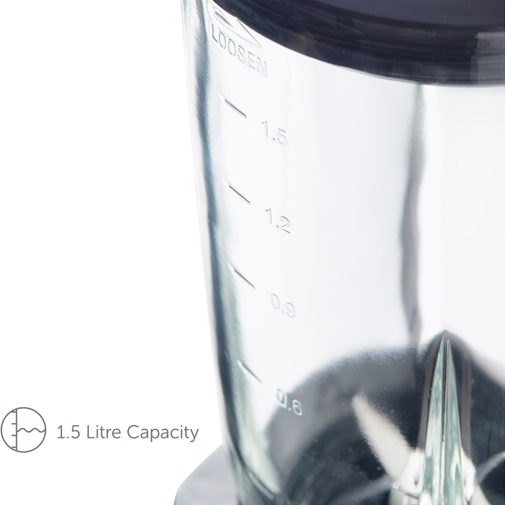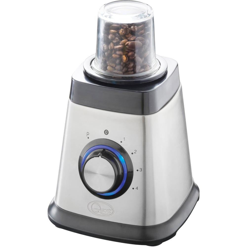 Make a variety of drinks or batch-prepare soups and sauces to enjoy with family and friends with Quest Nutri-Q Stainless Steel 1.5L Blender with Grinder 1000W. It includes a 1.5L removable glass jug with a lid and a pouring spout and has a stainless-steel body, which resists corrosion and is easy to wipe clean. Reaching speeds of up to 21000 RPM, the blender’s powerful 1000W motor and six stainless-steel blades will blend fruits, vegetables, and ice quickly and efficiently when mixed with a liquid. The durable, high-quality blades allow you to effortlessly create slushes, smoothies, soups, shakes and more. The blender has four-speed settings that allow you to get the perfect consistency for whatever you are blending. Easily switch between speeds via the electronic dial, which features an LED light. The kitchen blender also has a pulse setting, which is ideal for crushing ice and other hard ingredients such as nuts and seeds. The grinder attachment allows you to grind nuts, seeds, coffee beans and spices into fine pieces. The blender also features a 1.2m power cord, volume measurements on the side of the jar for your convenience, and non-slip feet for added safety and security.