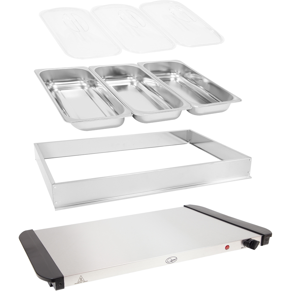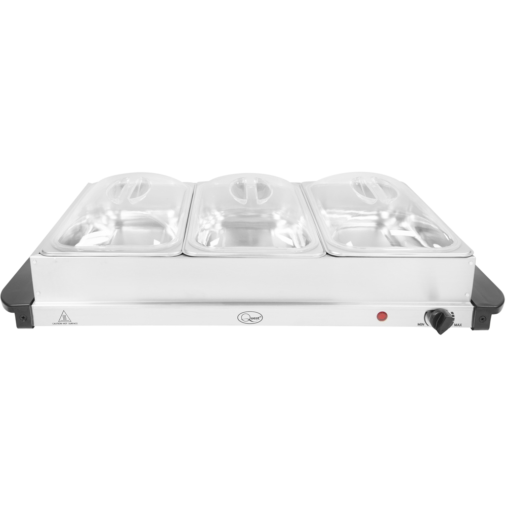 Make a practical addition to your space with this Quest Silver Large Buffet Server and Warming Plate. This compact buffet server is a fantastic addition to your cooking appliances and is perfect for keeping hot foods hot for several hours at parties, BBQs, breakfasts and other social events. This electric buffet server features three separate compartments that can each hold up to 2.4 litres of food. Each of the compartments comes complete with a clear lid that allows you to keep an eye on the food at all times. Also, the dial on the front of the buffet server allows you to set the temperature anywhere between 105° to 185°C. The heating elements react instantly, providing heat in a matter of seconds. If you simply remove the outer trays then you can place plates, bowls and gravy boats onto the base of the unit to keep them warm at all times. Plus, the buffet server measures 65 x 36cm and features non-slip feet to keep the device anchored to the table at all times.