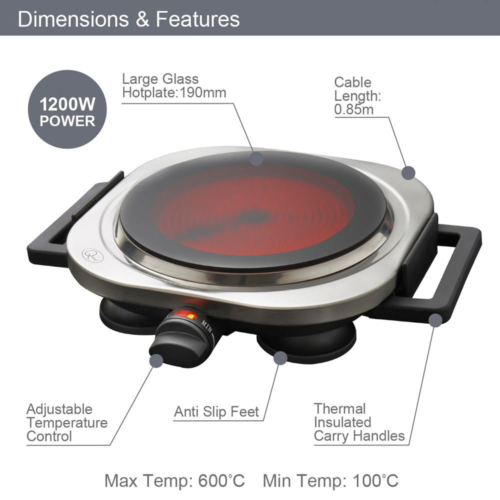 This Quest Single Ceramic Infrared Hot Plate can be used with all steel, glass and ceramic cookware and heats up quickly, with the temperature reaching 300°C within 36 seconds. Featuring a power indicator light, the hot plate includes minimum (100°C) to maximum (600°C) temperature settings, allowing you to meet all your cooking needs like keeping warm, boiling, and frying. For added safety, it includes overheat protection for ideal cooking. The compact hot plate has thermo-insulated handles designed to lift it easily without burning yourself, making it safe to move anywhere. Also, this makes the hot plate ideal for parties, camping or small accommodation and its handles are retractable for when you want to safely store it away. The cooking plate’s stainless-steel surface is durable, easy to clean and can withstand long-term use. Plus, the hob has an easy-to-clean glass plate to clean up any spilt food easily and nonslip feet to stop any accidents while cooking or cleaning. Power: 1200W.