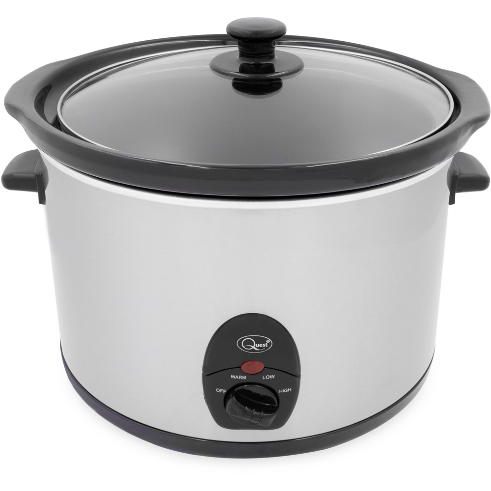 Enjoy easy cooking with this Quest Stainless Steel Slow Cooker. This 5-litre stainless-steel slow cooker provides hassle-free cooking options and allows you to produce delicious homemade meals for parties, family gatherings, or dinners for larger families. The ceramic pot can be removed from the main body of the slow cooker, allowing you to take it to the table ready for serving, and is dishwasher safe. The slow cooker features a transparent glass lid that allows you to keep an eye on the food whilst it is cooking. Also, it comes with three temperature settings that all offer a separate cooking experience. ‘High’ will cook the food for six to eight hours, ‘Low’ will cook the food for two to four hours, and ‘Keep Warm’ will simply keep the food hot until you’re ready to eat it. Plus, this slow cooker is perfect for making curries, stews, casseroles, soups, pot roasts, and even delicious desserts like crumbles, brownies and cobblers.