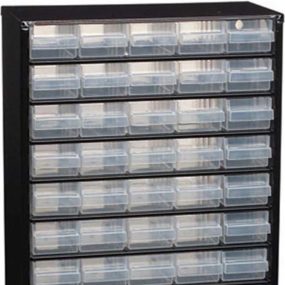 The Raaco C11-44 Metal Cabinet features a total of 44 drawers, which can be subdivided for better organization. This cabinet can either stand alone or be mounted on a wall. It is constructed from painted steel, while the drawers are made of polypropylene. The dimensions of the drawers are as follows: 40 drawers measuring 41 x 67 x 153 mm (150-00), three drawers measuring 64 x 91 x 154 mm (150-02), one drawer measuring 64 x 279 x 155 mm (150-03). Overall, the cabinet has a height of 510 mm, a width of 306 mm, and a depth of 147 mm. Its weight is 5.8 kg.