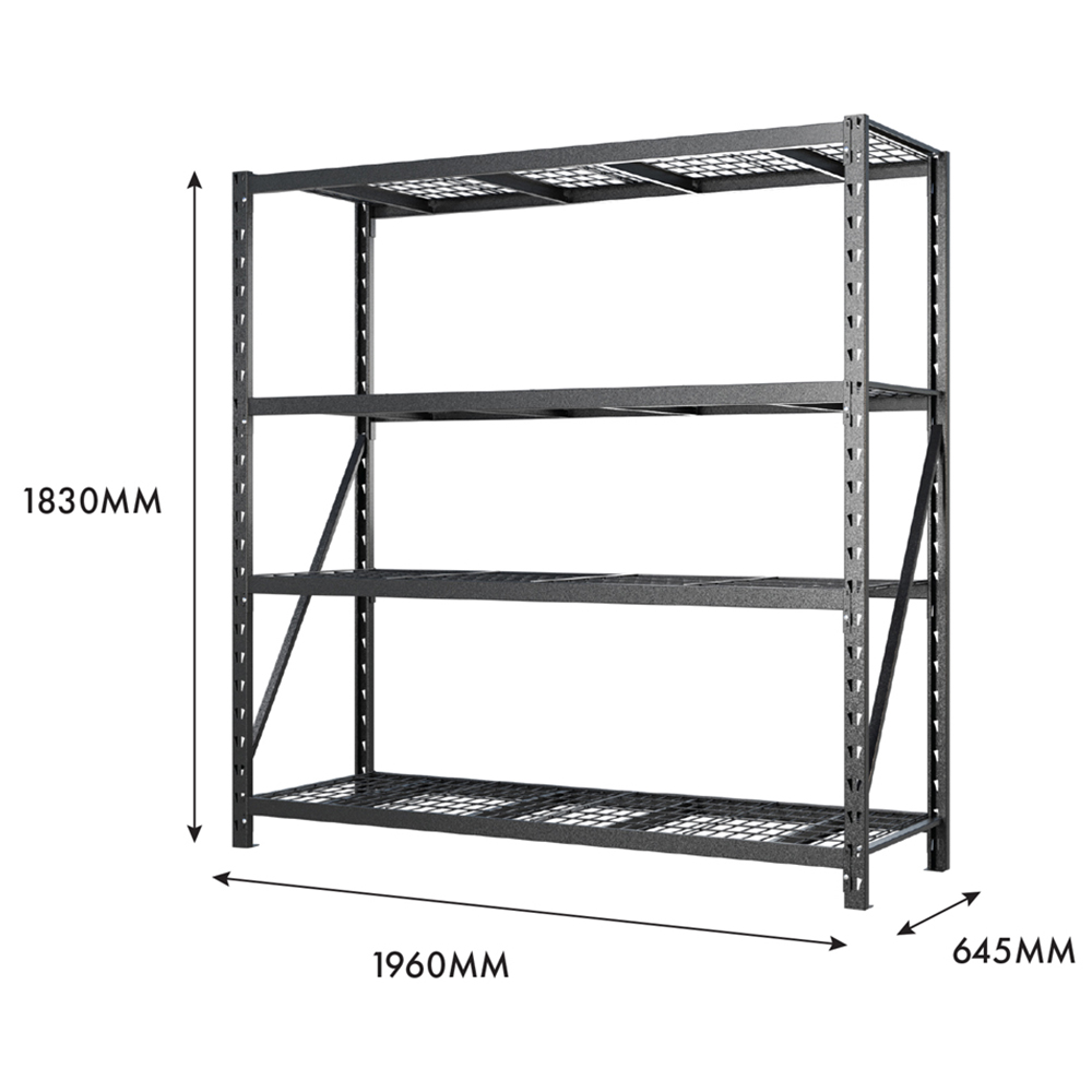 The Rack 1000 4 Wire Shelf Storage Unit is the ideal starting point for building your Rack 1000 system. Manufactured from strong, black powder coated steel, this Kit features 1830mm Uprights and 1872mm Beams. The 4 adjustable Wire Shelves are tested to hold up to 1000kg each and provide 1800x600mm of useable shelf space. Perfect for heavy paint cans, tools, work equipment and accessories, tubs, cartons and more. This Starter Kit includes: 2 x 1830mm Uprights, 8 x 1872mm Beams, 8 x 896mm Wire Shelves, 16 x Shelf Support Braces and 16 x Safety Pins. Easy to assemble - only a rubber mallet is required.