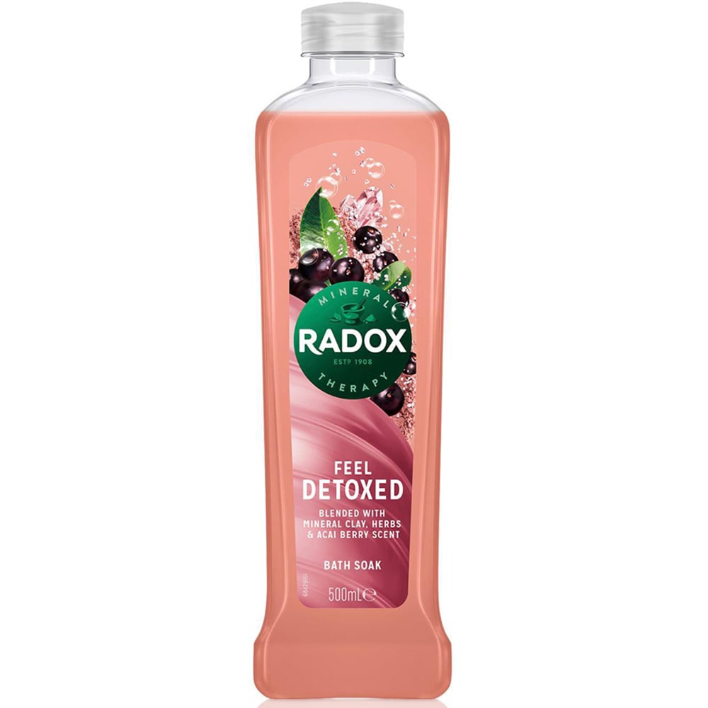 Radox 100% Nature Inspired Fragrances Bath Soak, Feel Detoxed, 6 Pack, 500ml. An uplifting bath soak that leaves your skin delightfully fragrant. Bath gel with sweet pomegranate and red apple scents inspired by nature's finest ingredients. A moisturising bath Mood changing fragrance bath soak which cleanses your body and makes your feel relaxed. A Bath Soak with the scent of fresh acai berry and clay will revive your body and mind. All Radox products contain a special blend of at least two active natural ingredients specially chosen to transform bodies and minds. Key Features : With a blend of clary sage and sea minerals scent. Radox - Nature Inspired Fragrance!. Mood changing fragrance pack which makes you feel relaxed. Suitable for all skin types. Feel fresh and clean all day. pH neutral, dermatologically tested. With the scent of rosemary and eucalyptus. Ingredients: Aqua, Sodium Laureth Sulfate, Sodium Chloride, Cocamidopropyl Betaine, Parfum, Citric Acid, Glycerin, Kaolin, Sodium Benzoate, Sodium Lactate, Sodium Lauryl Sulfate, Styrene/Acrylates Copolymer, Benzyl Alcohol, CI 17200, CI 19140, CI 42090. Warnings: If product gets in your eyes, rinse them with warm water. Avoid eyes and other sensitive areas. As we are always looking to improve our products, our formulations change from time to time, so please always check the product packaging before use.