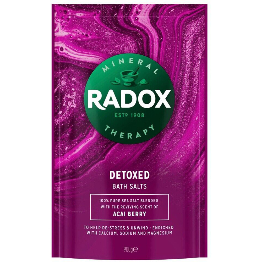 Radox Bath Salts Detoxed Bath Therapy, 4 Pack, 900g Radox Detoxed Bath Salts helps you to relax in a bath with our blended sea salts to wash away stresses and clear up your mind. At Radox, we have been taking inspiration from nature's incredible fragrances since 1908 to create refreshing shower gel, hand wash and bath products. We then capture their transformative effects with one goal in mind: to help people get in the mood they want to be in. The smell is not only one of the most important senses, but one of the most overlooked. Radox Muscle Relax Baths Salts helps you surrender to a warm soak with our mineral sea salts to soothe your tired muscles. At Radox, we have been taking inspiration from nature's incredible fragrances since 1908 to create refreshing shower gel, hand wash and bath products. Soak in our pampering detox experience with acai berry scent to help revive your body and clear your mind. Radox blended sea salts to help remove impurities. Radox Detoxed Bath Salts helps you to relax in a bath with our blended sea salts to wash away stresses and clear up your mind. Key Features : Bath salts with 100% pure sea salts. Acai Berry scented bath salts inspired by natures ingredients. Blending mineral salts since 1908. Contains Calcium, Sodium and Magnesium. How to use: Pour a generous amount (2 to 3 handfuls) of Bath Salts under warm running water. Let the salt dissolve fully & then step carefully into the water. Safety Warnings: Avoid getting into the eyes. if you do, rinse well with cool, clean water. take care when stepping out of the bath as it may be slippery. Ingredients: Maris Sal, Propylene Glycol, Parfum, Disodium EDTA, Coumarin, Hexyl Cinnamal, Limonene, Linalool.
