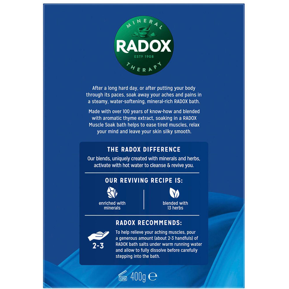 Radox muscle soaks bath salts can help you relax and unwind after a long and tiring day as these bath salts are rich in minerals which can help to ease tired and aching muscles. They are expertly blended with Thyme which is a natural ingredient known to soothe and relax not only will your whole body feel instantly energised the moment you step into the bath but you will be left smelling ideal the moment you step out. Radox has been soothing tired limbs since 1908 when original bath salts for aching feet began our long success in mixing minerals and herbs into relaxing blends. More than 100 years later we're still searching nature for the blends of soothing and rejuvenating ingredients we use. Chamomile, eucalyptus, green and white tea, jasmine, thyme, lotus flower and orange blossom, rosemary, calendula and rose are just some of the natural extracts that enrich our products and your experience - all chosen for their ability to relax and refresh. Features: Expertly blended with thyme to help soothe muscular aches and pains. Relax in a hot bath of Radox muscle soak herbal bath salts. Mineral-rich natural salts which help ease tired and aching muscles. Soak away your aches and pains in a steamy bath containing 100 years of Radox know-how. How to Use: Pour a generous amount (approximately 2 handfuls) of Radox Muscle Soak Herbal Bath Salts under warm running water and allow them to dissolve fully before carefully stepping into the bath. Safety Warning: Avoid getting into the eyes. If you do, rinse well with cool, clean water. Please take care when stepping out of the bath as it may be slippery. Ingredients: Maris Sal, Sodium Sesquicarbonate, Aqua, Isopropyl Myristate, Parfum, Propylene Glycol, Sodium Carbonate, Sodium Lauryl Sulfate, Thymus Vulgaris (Thyme) Flower/Leaf Extract, Linalool, CI 42090, CI 77007. Package Includes: 6x Radox Muscle Soak Bath Salts - 400g.