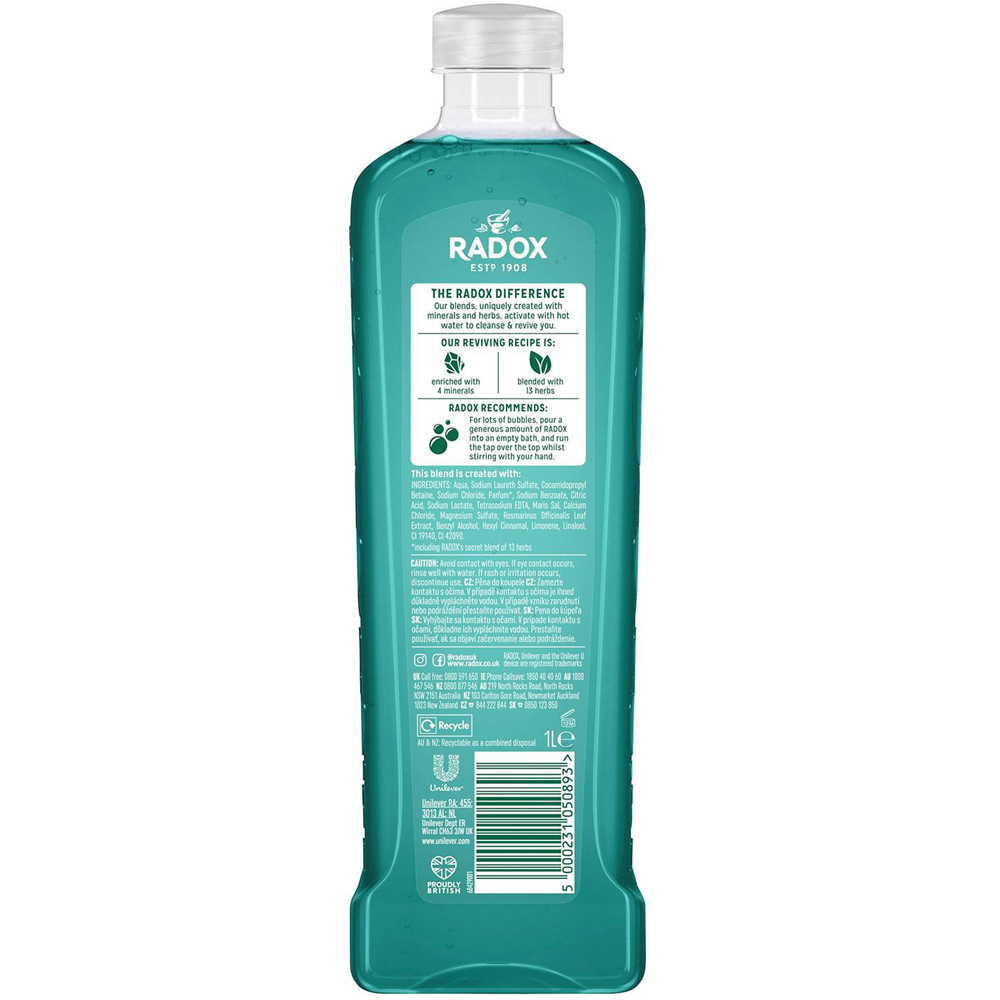 Radox Mineral Therapy Bath Soak Stress Relief with Rosemary and Eucalyptus Scent 1L, 3 Pack. Enjoy the soothing blend of minerals, rosemary and eucalyptus scent with RADOX Stress Relief Bath Soak. From troubles to bubbles, close your eyes and let the restorative bath soak cleanse your body and revive you. RADOX Stress Relief Bath Soak is enriched with 4 minerals and RADOX's unique blend of 13 herbs that help you indulge in a relaxing bath therapy ritual. It works wonders on a restless mind. These blends, uniquely created with minerals and herbs, activate with hot water to cleanse and revive you in a rejuvenating bubble bath. Features: Enjoy the unique, soothing blend of minerals and herbs in RADOX Stress Relief Bath Soak which activates with hot water to cleanse and revive you. From troubles to bubbles, close your eyes and let this soothing bath soak with rosemary and eucalyptus scent leaving your skin delightfully fragrant. Each of our bath soak's fragrance combinations is specially designed to unleash a mood, whether you want to be energised or refreshed, uplifted or soothed. Our bath soaks are suitable for daily use pour the bath product under running water and unwind in an aromatic bubble bath. RADOX Stress Relief Bath Soak is pH skin neutral and suitable for all skin types. How to Use: For best results, pour bath gel under running water and relax. For lots of bubbles, pour a generous amount of RADOX Stress Relief Bath Soak into an empty bath, and run the tap over the top whilst stirring with your hand. Ingredients: Aqua, Sodium Laureth Sulfate, Cocamidopropyl Betaine, Sodium Chloride, Parfum, Sodium Benzoate, Citric Acid, Sodium Lactate, Tetrasodium EDTA, Calcium Chloride, Maris Sal, Magnesium Sulfate, Rosmarinus Officinalis Leaf Extract, Benzyl Alcohol, Hexyl Cinnamal, Limonene, Linalool, CI 19140, CI 42090. Box Contains: 3x Radox Mineral Therapy Bath Soak Stress Relief, 1L.