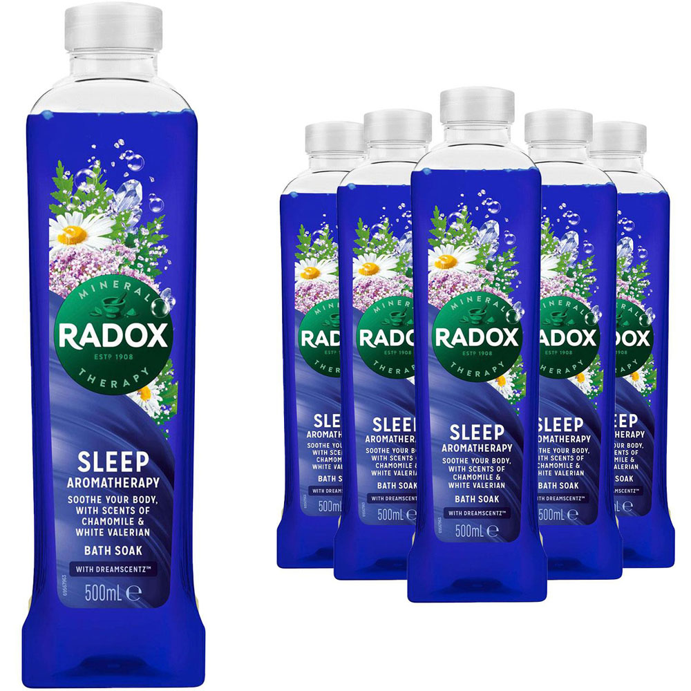 Radox Mineral Therapy Bath Soak Sleep Aromatherapy Dream Scents 500ml, 6 Pack. Enjoy the unique, soothing blend of herbs, minerals, chamomile and white valerian scent with RADOX Sleep Aromatherapy Bath Soak. From troubles to bubbles, close your eyes and let the calming bath soak cleanse your body, de-stress and revive you. RADOX Sleep Aromatherapy Bath Soak is enriched with 4 minerals and RADOX's unique blend of 13 herbs that helps you indulge in a soothing bath therapy ritual. Blended with our DreamScentz fragrance, it improves the quality of sleep. Our blends, uniquely created with minerals and herbs, activate with hot water to cleanse and revive you in a soothing bubble bath. Features: Each of our bath soak's fragrance combinations is specially designed to unleash a mood, whether you want to be energised or refreshed, uplifted or soothed. Our bath soaks are suitable for daily use – pour the bath product under running water and unwind in an aromatic bubble bath. Radox Sleep Aromatherapy Bath Soak is pH skin neutral and suitable for all skin types Relax in a bath with our delightfully fragrant bath soak, letting it cleanse your body and relax your senses. How to Use: Pour bath gel under running water and relax. For lots of bubbles, pour a generous amount of RADOX Sleep Aromatherapy Bath Soak into an empty bath, and run the tap over the top whilst stirring with your hand. Ingredients: Aqua, Sodium Laureth Sulfate, Cocamidopropyl Betaine, Sodium Chloride, Parfum, Sodium Benzoate, Citric Acid, Tetrasodium EDTA, Maris Sal, Calcium Chloride, Sodium Lactate, Magnesium Sulfate, Chamomilla Recutita Flower Extract, Jasminum Officinale Flower Extract, Benzyl Alcohol, Benzyl Salicylate, Hexyl Cinnamal, Linalool. Safety Warnings: Avoid contact with eyes. If eye contact occurs rinse well with water. If rash or irritation occurs, discontinue use. Box Contains:6 Pack Radox Mineral Therapy Bath Soak Sleep Aromatherapy 500ml.