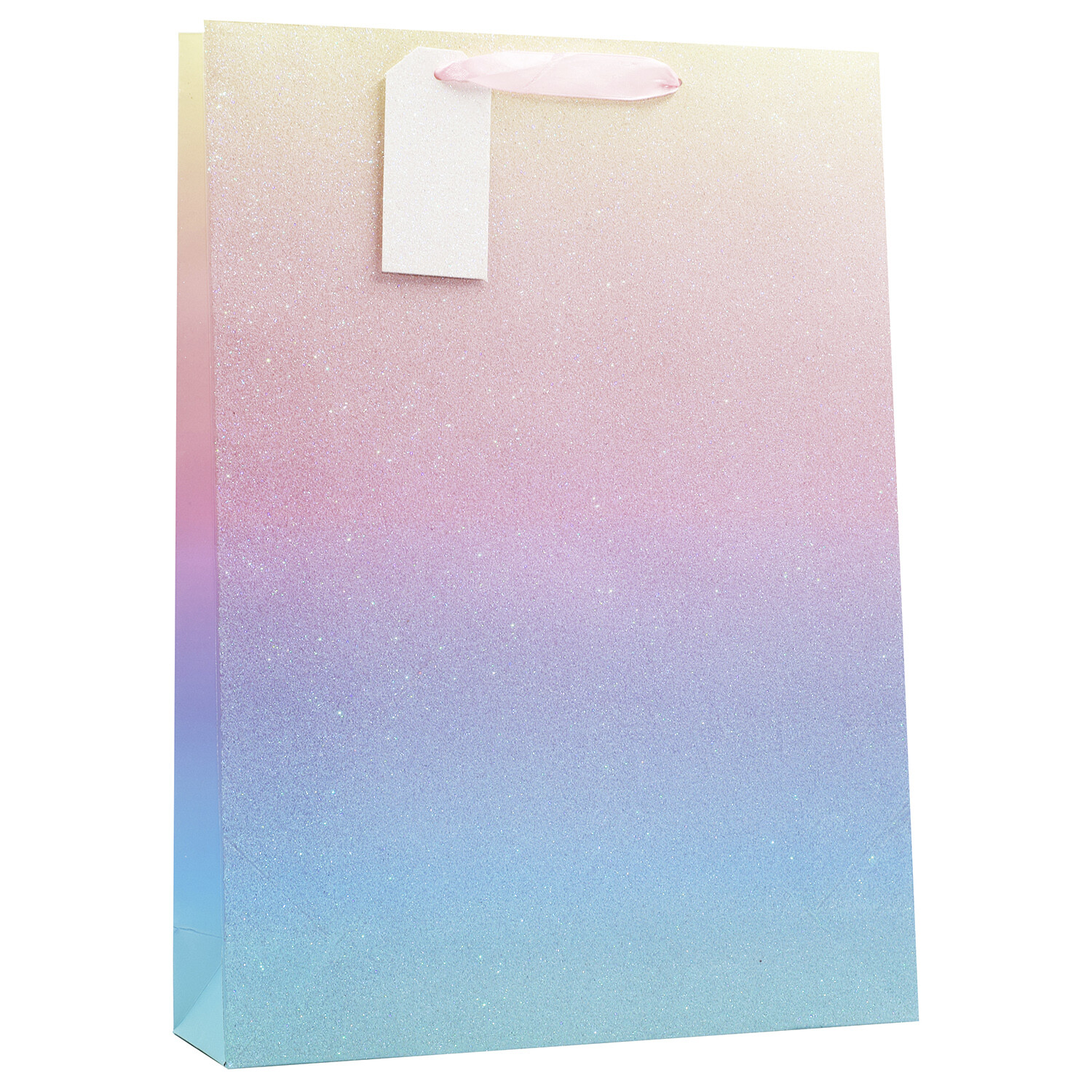 Super pretty and stylish, this Rainbow Glitter Bag is made with thick, recycled board and has a gentle, ombre glitter finish. Featuring a matching gift tag and elegant pink ribbon handles, this bag is perfect for presenting gifts to someone you love for their birthday, graduation, baby shower, and more.