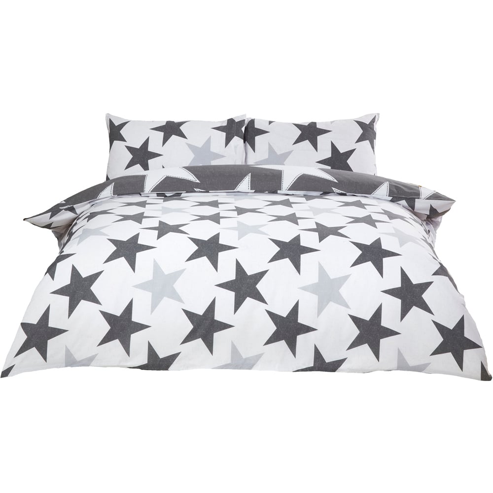 Upgrade your space with the Rapport Home All Stars Single Grey  Duvet Cover Set. The set showcases a captivating pattern of scattered stars on its front, complemented by a smaller repeated star design on its reverse. The contrasting background shade adds an extra touch of style, making this design fully reversible. This eye-catching printed bedding is bound to appeal to individuals of all ages. The set includes one duvet cover measuring 135 x 200cm and a matching pillowcase measuring 50 x 75cm each. It is equipped with a convenient popper closing mechanism.
