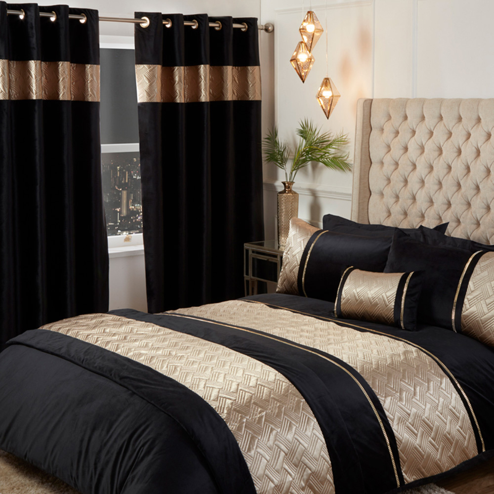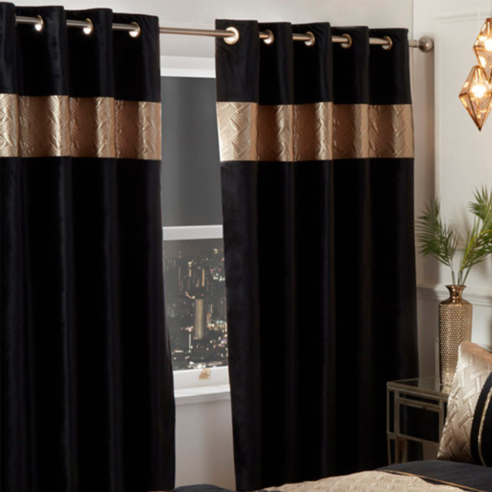 Great for glitz lovers, these Capri Curtains from Rapport Home are perfect to add a touch of privacy to your room with style. Finished in a classic black and gold colours, they feature a geometric metallic border on a smooth matte satin. Complete with eyelet headers for easy hanging, these lined energy-efficient curtains are perfect to embellish your windows. Size: 66 x 72 inch.