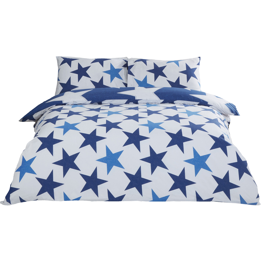 The Rapport Home Double Navy All Stars Duvet Set showcases a captivating pattern of scattered stars on its front, complemented by a smaller repeated star design on its reverse. The contrasting background shade adds an extra touch of style, making this design fully reversible. This eye-catching printed bedding is bound to appeal to individuals of all ages. The set includes one duvet cover measuring 200 x 200cm and two matching pillowcases measuring 50 x 75cm each. It is equipped with a convenient popper closing mechanism.