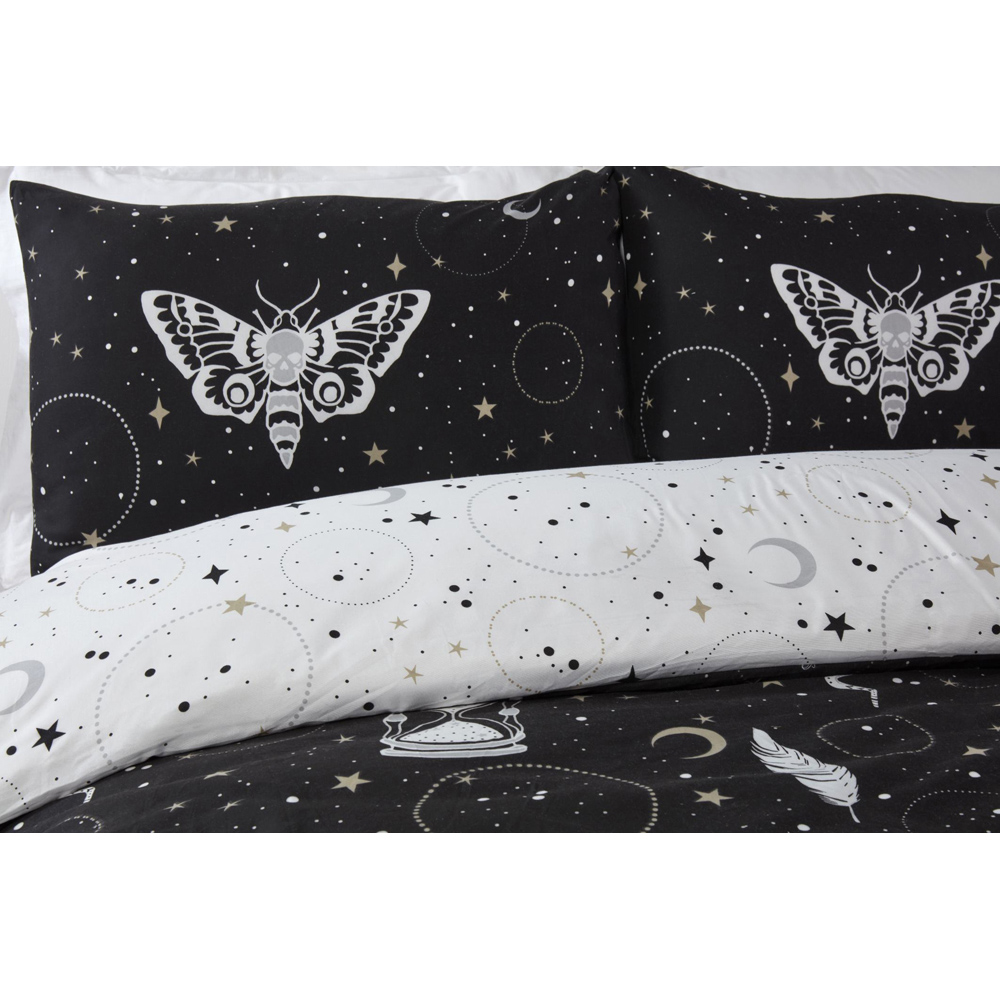 Create a mysterious and captivating ambience withe the Rapport Home Gothic Magick Double Multicolour Microfibre Duvet Set. This exceptional bedding collection is crafted to transport you to a realm where the mystical and the macabre intertwine, adding an irresistible charm to your bedroom decor. The centrepiece of this hauntingly beautiful set is the mesmerizing Hamsa Hand, accompanied by an array of eerie elements that capture the essence of Halloween. With its reversible design, this set offers versatility and style. Included in the set are a duvet cover (200 x 200cm) and two matching pillowcases (50 x 75cm), all made from easy-care fabric that requires minimal ironing.