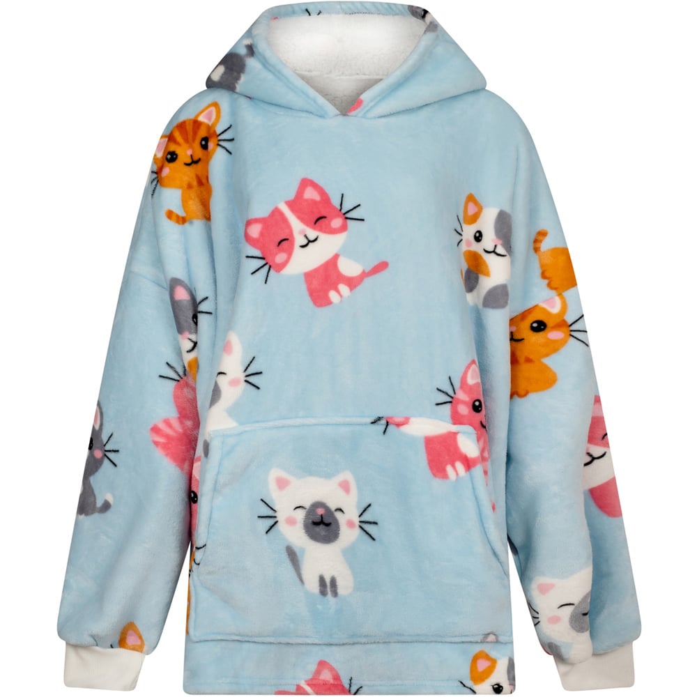 Invite more comfort into your life with the Rapport Home Kitties Fleece Hoodie Oversize Multicolour. This cosy hoodie features adorable smiling kittens on a baby blue background, creating a fun and cheerful look. Made from sherpa fleece, it offers incredible warmth and comfort, perfect for both adults and children. The irresistibly soft texture and charming design makes it ideal to keep you snug all day long. Its one-size-fits the most design makes it easy to wear, and the super soft fleece lining adds an extra layer of cosiness.