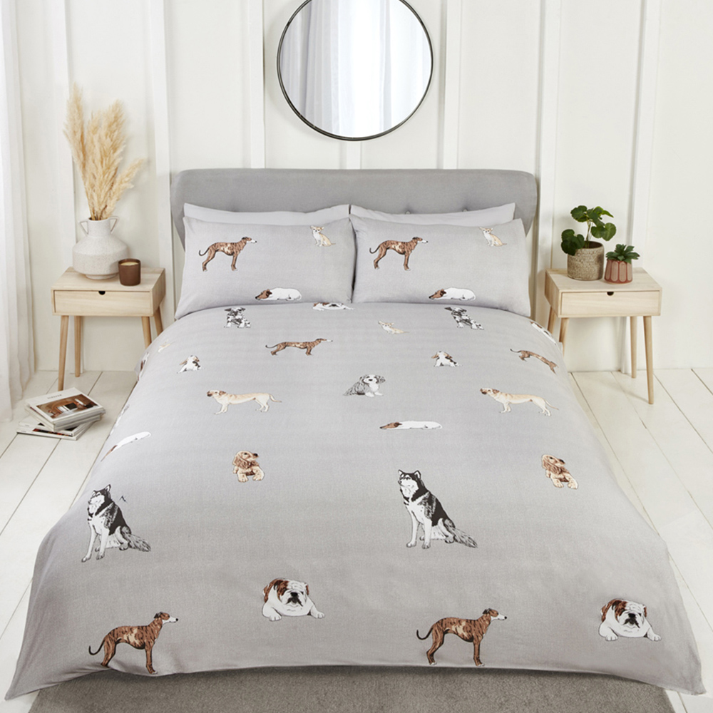 Stylish and sophisticated, this canine-themed Paws and Tails Duvet Set from Rapport Home is perfect to make a fun addition to your bedroom. The set includes a duvet cover and two matching pillowcases made with 180 thread count microfibre, making it non-iron, durable and machine washable. Finished in classic grey, it features hand-drawn doggies on a beautifully textured ground and with a stripe reverse making it fully reversible. Comfy and easy to care for, this duvet set is perfect for pet lovers. Size: King. Dimensions: Duvet Cover- 230 x 220cm and Pillowcases- 50 x 75cm.