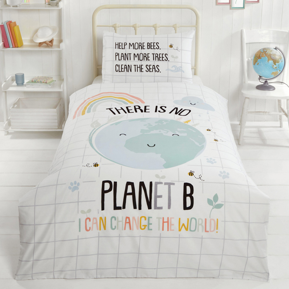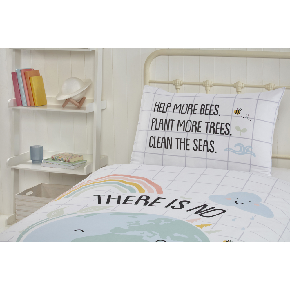 Adorn your bedroom decor with the goodness of nature with the Rapport Home PH Planet B Single Multicolour Duvet Cover Set. The set includes a duvet cover and a panel-printed pillowcase made using sustainably sourced BCI cotton and recycled polyester. Designed by British designers, this set shows the world with the slogan- there is no Planet B I can change the world. It also features delicate bees, trees and rainbows on the reverse. Comfy and easy to care for, it will make a colourful addition to your decor. Size: Single. Dimensions: Duvet Cover- 135 x 200cm and Pillowcases- 50 x 75cm.