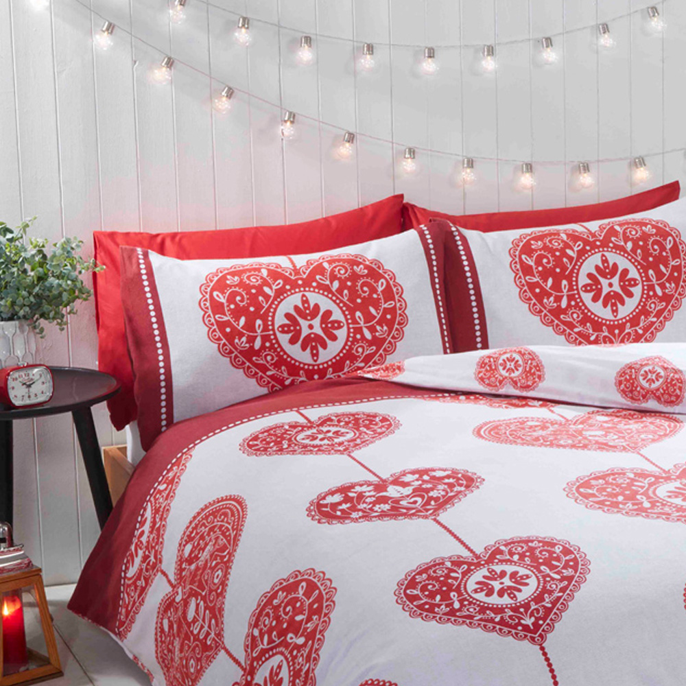 Enhance your comfort with the Rapport Home Scandi Heart Single Red Brushed Cotton Reversible Duvet Set. Features a stunning heart pattern with a Scandinavian style feel, this set makes a stylish addition to your space. Also, with 100% brushed cotton, the set is super comfortable and durable. Fully reversible, simply flip over to use the alternative contrasting look in a different pattern. This duvet set comes with a duvet cover and a matching pillowcase. Size: Duvet cover: 135 x 200cm. Pillowcase: 50 x 75cm.