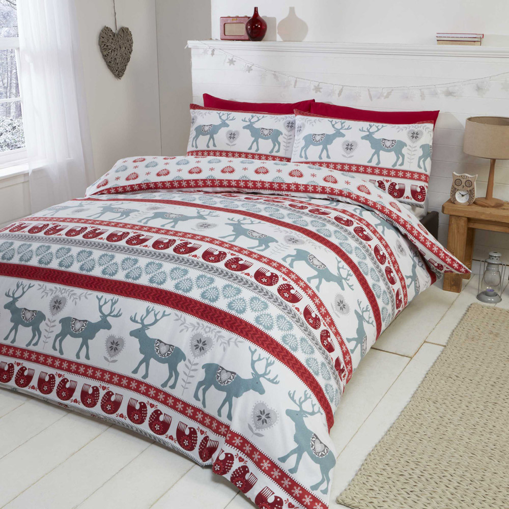 Discover the perfect blend of style and comfort with the Rapport Home Scandi King Size Red Brushed Cotton Reversible Duvet Set. This charming Scandi-inspired set features reindeer and hearts banded down the duvet cover. Offering a perfect Christmassy feel - this duvet set makes an interesting addition, especially during the festive season. Also, with 100% brushed cotton, the set is super comfortable and durable. Fully reversible, simply flip over to use the alternative contrasting look in a different colourway. This duvet set comes with a duvet cover and two matching pillowcases. Size: Duvet cover: 230 x 220cm. Pillowcases: 50 x 75cm.