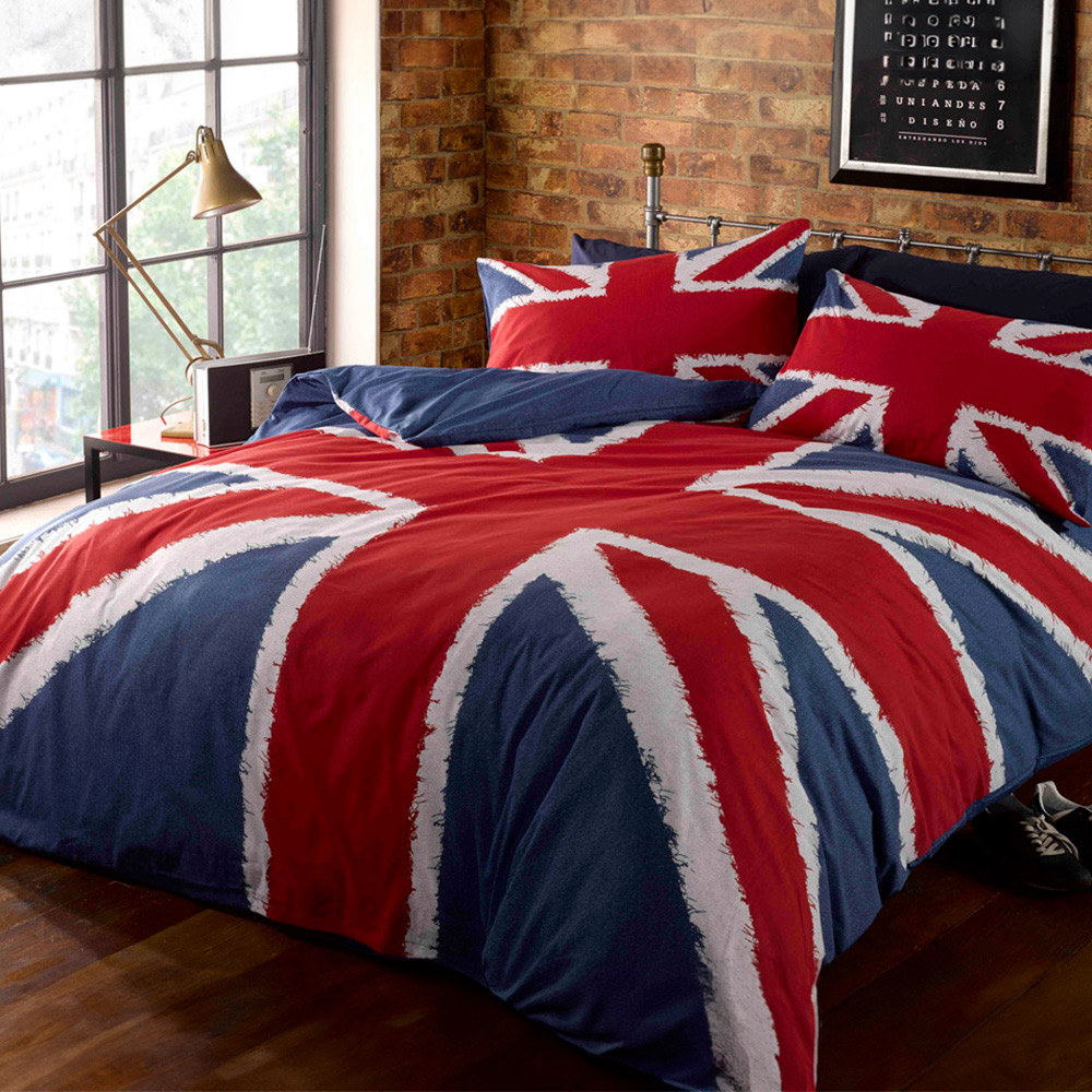 The Rapport Home Single Multicolour Union Jack Duvet Set showcases a striking combination of red, white, and blue. This duvet set boasts a vintage denim style printed design of the iconic union flag, accompanied by matching pillowcases. The reverse side features a simple denim textured print. The set includes one duvet cover measuring 135 x 200cm and a matching pillowcase measuring 50 x 75cm. Made from easy-care fabric, this duvet set is not only visually appealing but also convenient to maintain. It is equipped with a popper closing mechanism for easy use.