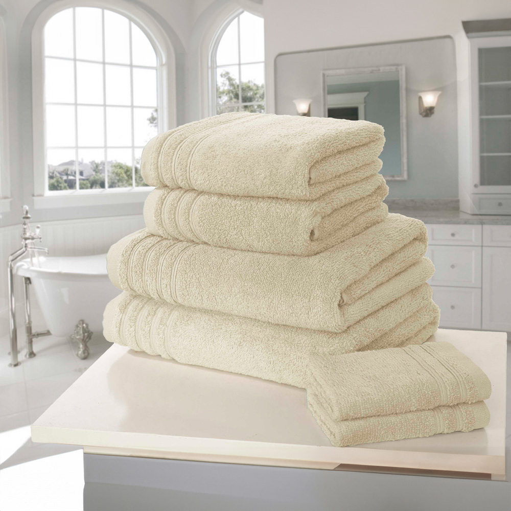 Experience the luxury of the Rapport Home So Soft Cream Cotton Hand Towel. This plain dyed hand towel features a matching woven border detail, adding a touch of sophistication to your bathroom. Crafted from soft, fluffy pure cotton with zero-twist technology, it ensures lasting softness and quick drying after every wash. Measuring 50 x 80cm, this hand towel is made from absorbent natural cotton fibres and designed for easy care, maintaining its quality and comfort wash after wash.