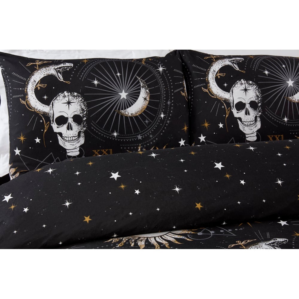 Complete your bedroom set with this Gothic-inspired Tarot MF Duvet Set by Rapport Home. This single-size duvet set is designed to transform your bedroom into a mystical realm of dark allure. You can embrace the dark beauty of the night with a striking blend of skulls, suns, and moons, perfect for those who revel in the spirit of Halloween all year round. Made from 100% polyester, this multicolour set is non-ironable, which makes it durable and long-lasting. The duvet set features one duvet cover of size 135 x 200cm and one matching pillowcases of size 50 x 75cm.