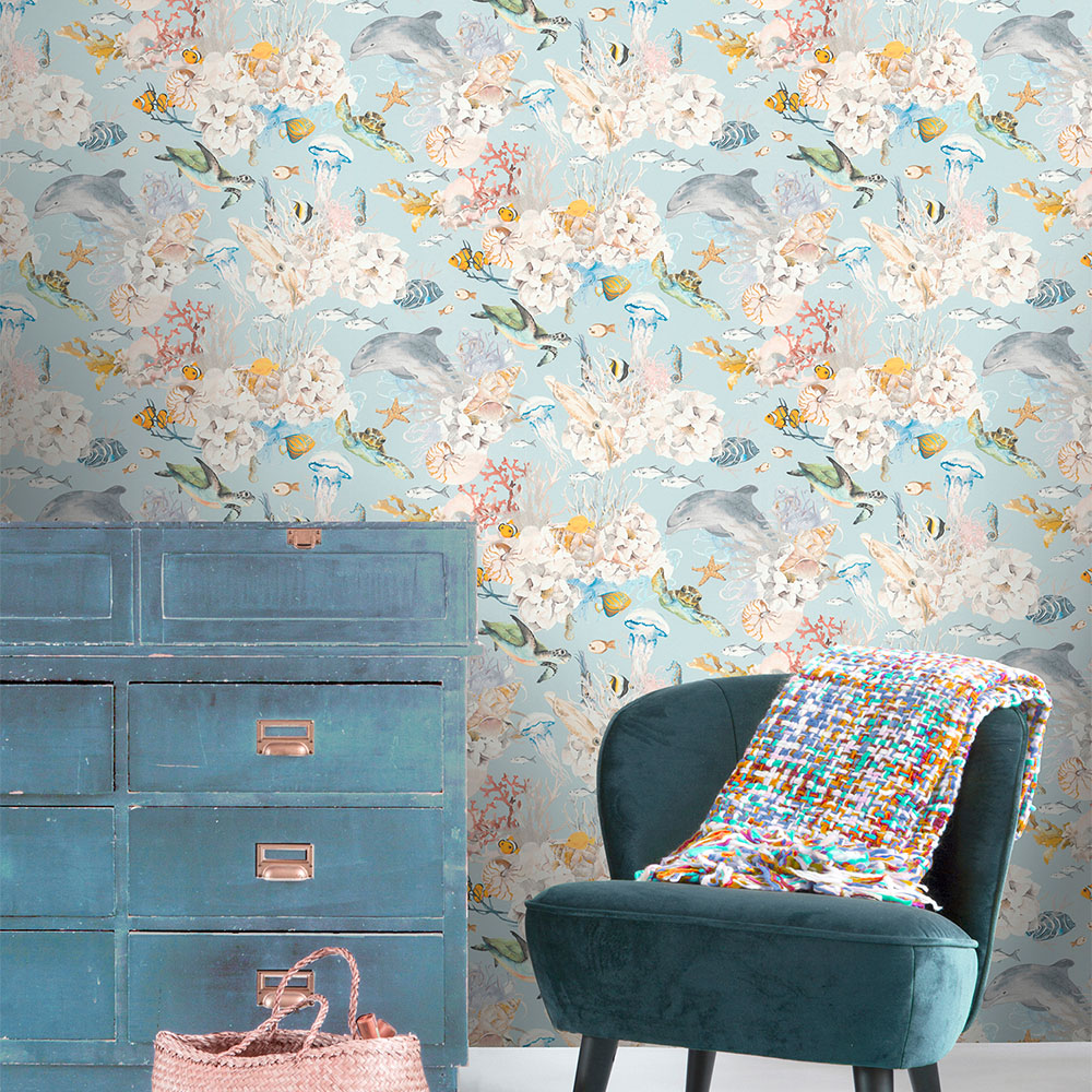 Build an oceanic paradise in your space with the Rasch Coral Reef Blue Multi Wallpaper. This paste the wall design offers a stunning underwater scene, featuring smiling turtles, graceful jellyfish, friendly dolphins and fish resembling Nemo. This adds a cute element to your kids living space. It is set against a soft pastel coloured coral reef background. This wallpaper sticks seamlessly to the wall, making your decoration quick and easy.