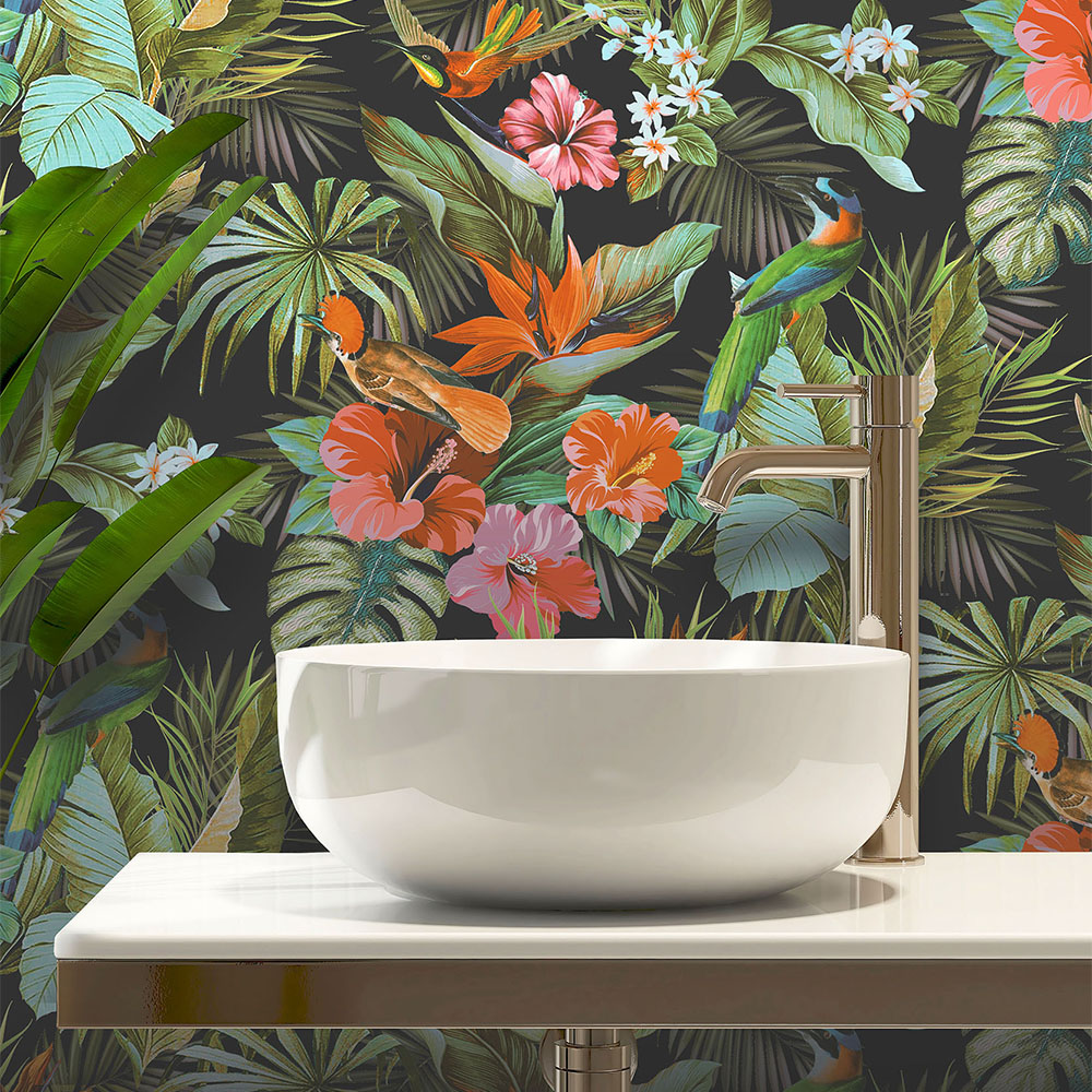 Transform your living space with the vibrant beauty of nature using the Rasch Paradise Birds Black and Multicolour Wallpaper. Featuring brightly coloured tropical leaves, birds, and hibiscus flowers against a striking black backdrop, this eye-catching heavyweight wallpaper brings a touch of paradise into your home. Elevate your living space with a bold, nature-inspired theme and create a captivating feature wall using the wallpaper. Crafted for quality and ease, this heavyweight wallpaper effortlessly conceals minor imperfections on your walls and is quick and simple to hang. Roll Length: 10m. Roll Width: 53cm. Pattern Repeat: 64cm. Pattern Match: Offset Match. Application: Paste the Paper.