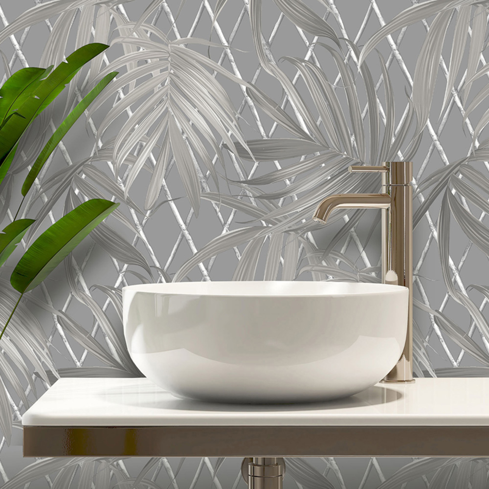 Redefine your living space with the breathtaking beauty of nature by incorporating the Rasch Paradise Palm Grey Wallpaper. The striking contrast between palm leaves and bamboo trellis creates a mesmerising visual impact, seamlessly blending the natural allure of tropical foliage with the refined artistry of bamboo design. Whether adorning the walls of a tropical-themed living area, a cosy reading corner, or a tranquil bedroom sanctuary, this wallpaper will transport you to a lush, exotic paradise. Embrace the essence of the outdoors with this effortless palm leaf design set against a trellis in soothing silver-grey shades. The wallpaper is perfect for creating a stunning feature wall. Additionally, its high-quality, heavyweight construction makes it quick and easy to hang while effectively concealing minor imperfections on your walls. Roll Length: 10m. Roll Width: 53cm. Pattern Repeat: 64cm. Pattern Match: Offset Match. Application: Paste the Paper.