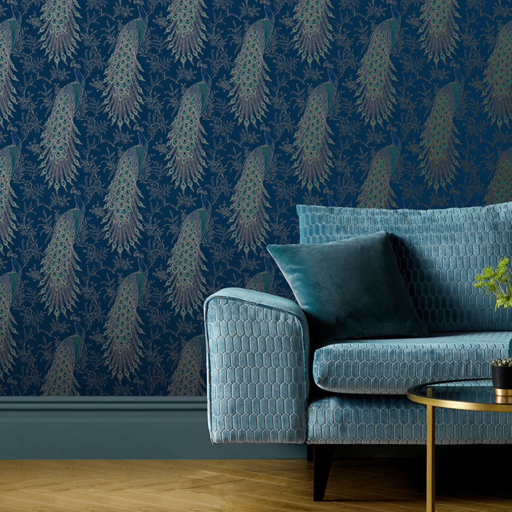 Transform your home into a majestic abode with Rasch Peacock Navy Blue Wallpaper. This captivating wallpaper features majestic peacocks with metallic detail. It is set against a rich navy background and perfectly blends opulence elegance with natural beauty. This peacock wallpaper creates a luxurious and visually stunning statement piece for any room.