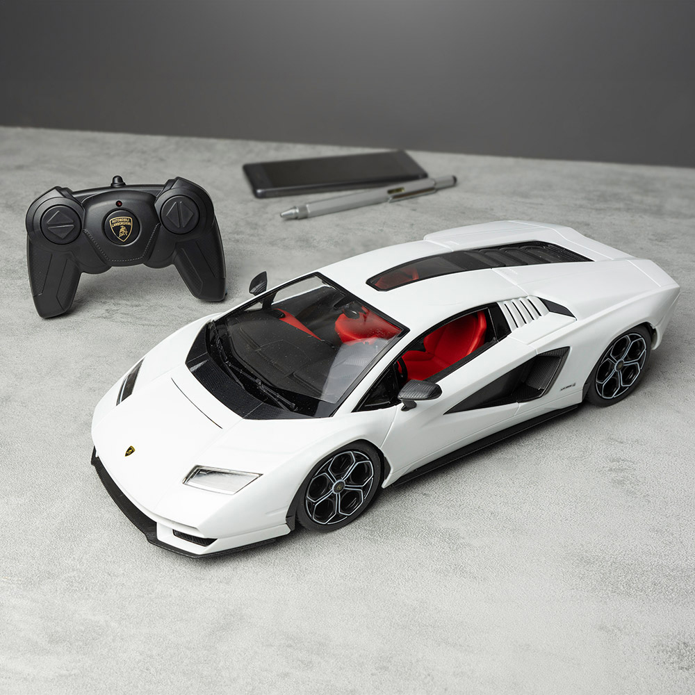 Experience speed and style with the Remote Control Lamborghini Countach LPI 800-4, a detailed 1:18 scale replica of the legendary supercar. Finished in sleek white, this RC car offers precise control with forward, reverse, left/right steering, and working headlights for realistic play. Perfect for car enthusiasts and kids alike, the low-suspension design is ideal for smooth surfaces. Batteries required (4 x AA for car, 2 x AA for remote, not included).