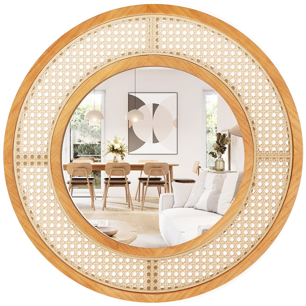 Bring a touch of natural elegance to your space with the Costway Natural Rattan Round Wall Mirror 65cm. It features a hand-woven PVC rattan and a charming wooden frame. This compact yet stylish mirror enhances any room, from bedrooms to hallways, with its high-definition aluminium glass that not only makes spaces appear larger but also ensures safety with its shatter-proof and explosion-proof qualities. Easy to install with one metal hook and two expansion screws, this mirror combines timeless design with practicality, making it a perfect addition to various decorative styles.