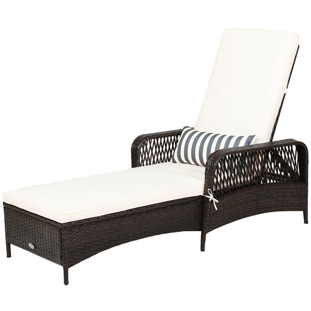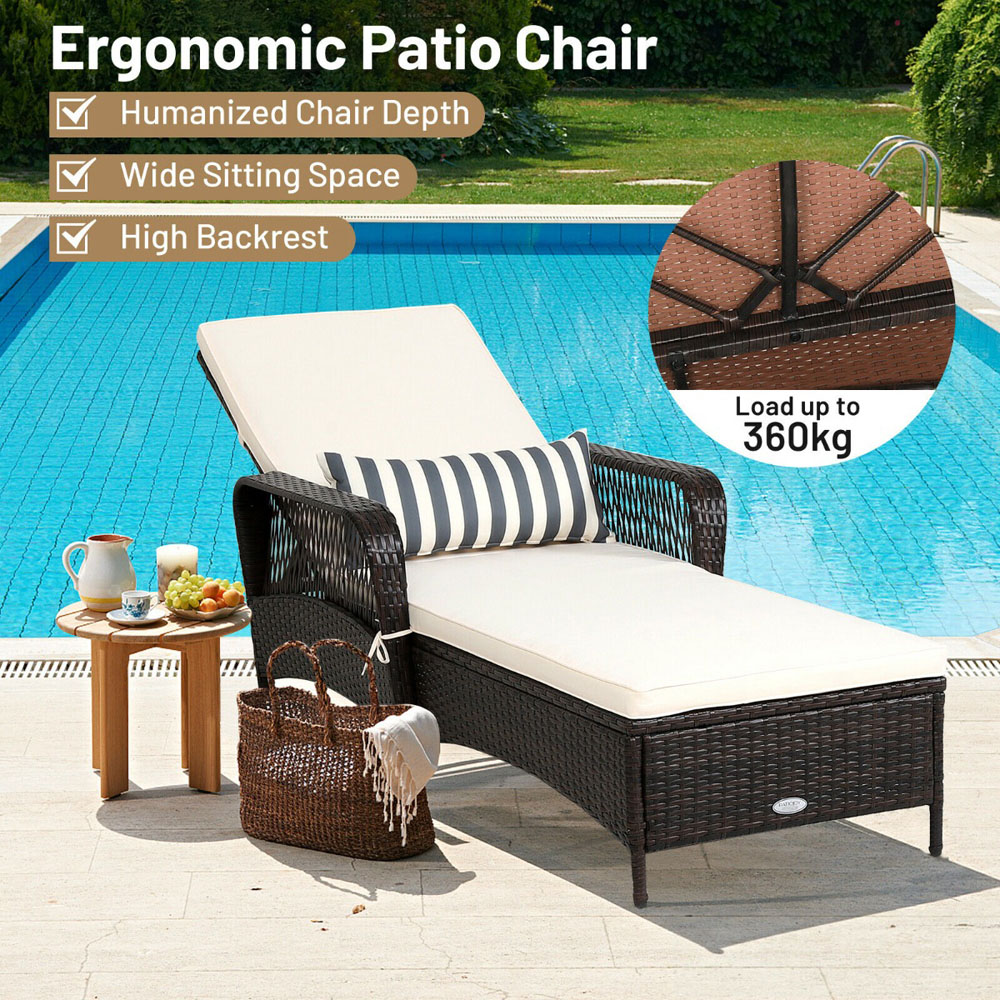 Elevate your outdoor relaxation with the Costway Single Seater Rattan Sun Lounger with Removable Cushion and Pillow. It combines a sophisticated design with unmatched functionality. This lounger offers a plush sitting cushion and a supportive lumbar pillow, ensuring maximum comfort whether you're sunbathing or enjoying a quiet evening under the stars. Its durable PE rattan and robust steel frame are built to withstand various weather conditions, making it perfect for any garden, porch, or poolside setting. The six-position adjustable backrest allows you to effortlessly switch from sitting to sleeping, tailoring your relaxation experience to your personal preference. With easy assembly and straightforward cleaning, this sun lounger promises both luxury and convenience for endless serene moments outdoors.