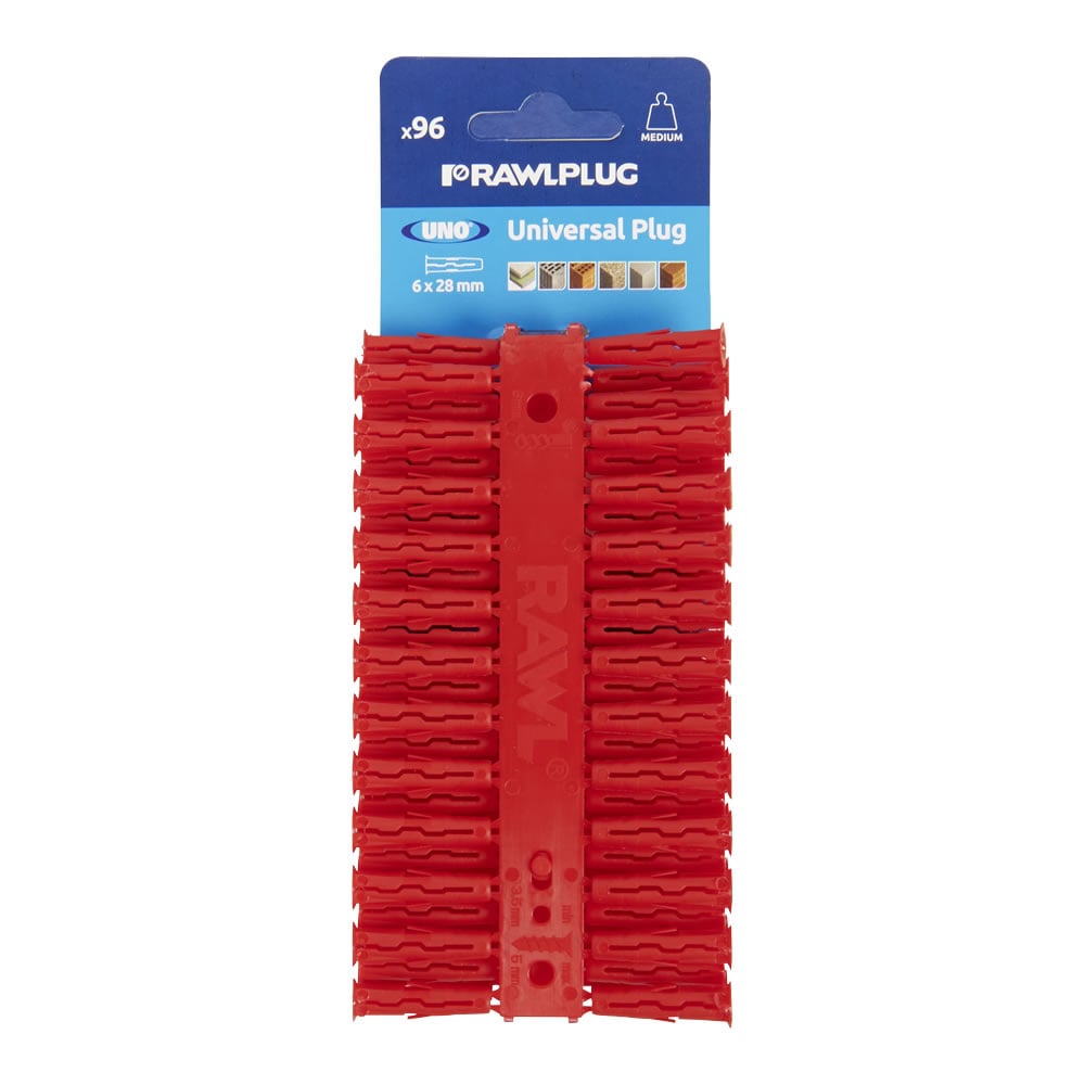 The Uno Rawllug ack of 96 universal lugs in red is ideal for a variety of base materials, hollow or solid. With their unique slit design, these lugs rovide secure anchorage, while the anti-rotation feature revents them from sinning in the hole. Rawllug size: 6 x 28mm. Drill bit size: 6mm. Screw size: 3.5mm to 5mm.