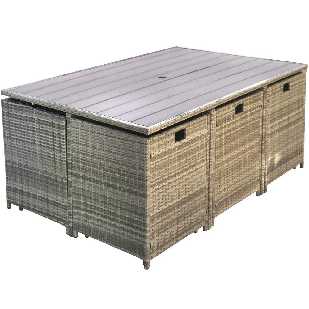 Upgrade your outdoor space with the Hestia rattan garden furniture cube set. Whether it is a family BBQ, a quiet morning with coffee, or hosting friends, this set is designed for all outdoor moments. Made from high-quality, weather-resistant PE rattan, it is built to last through rain or shine while keeping its good looks. The neutral colours blend perfectly with any garden, patio, or decking, adding a touch of style wherever placed. This 11-piece set includes six comfy armchairs, four stools, and a spacious dining table with a handy parasol hole. Each piece has deep-filled cushions, making it easy to sit back and relax for hours. The wooden slatted tabletop adds a sleek touch, and it is a breeze to clean. When not in use, everything tucks neatly under the table thanks to the cube design, saving space without losing style. Whether there is a small patio or a big garden, the lightweight frame allows for easy movement. Low-maintenance and durable, a quick wipe is all that is needed to keep it looking fresh. Ready to entertain, dine, or just enjoy some downtime outdoors, this set has got you covered. Delivered on a pallet in two to three working days, kerbside delivery only.