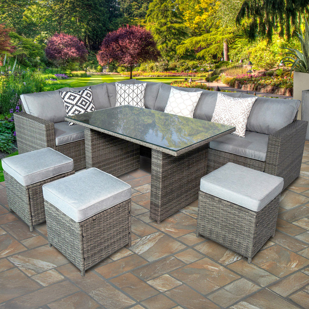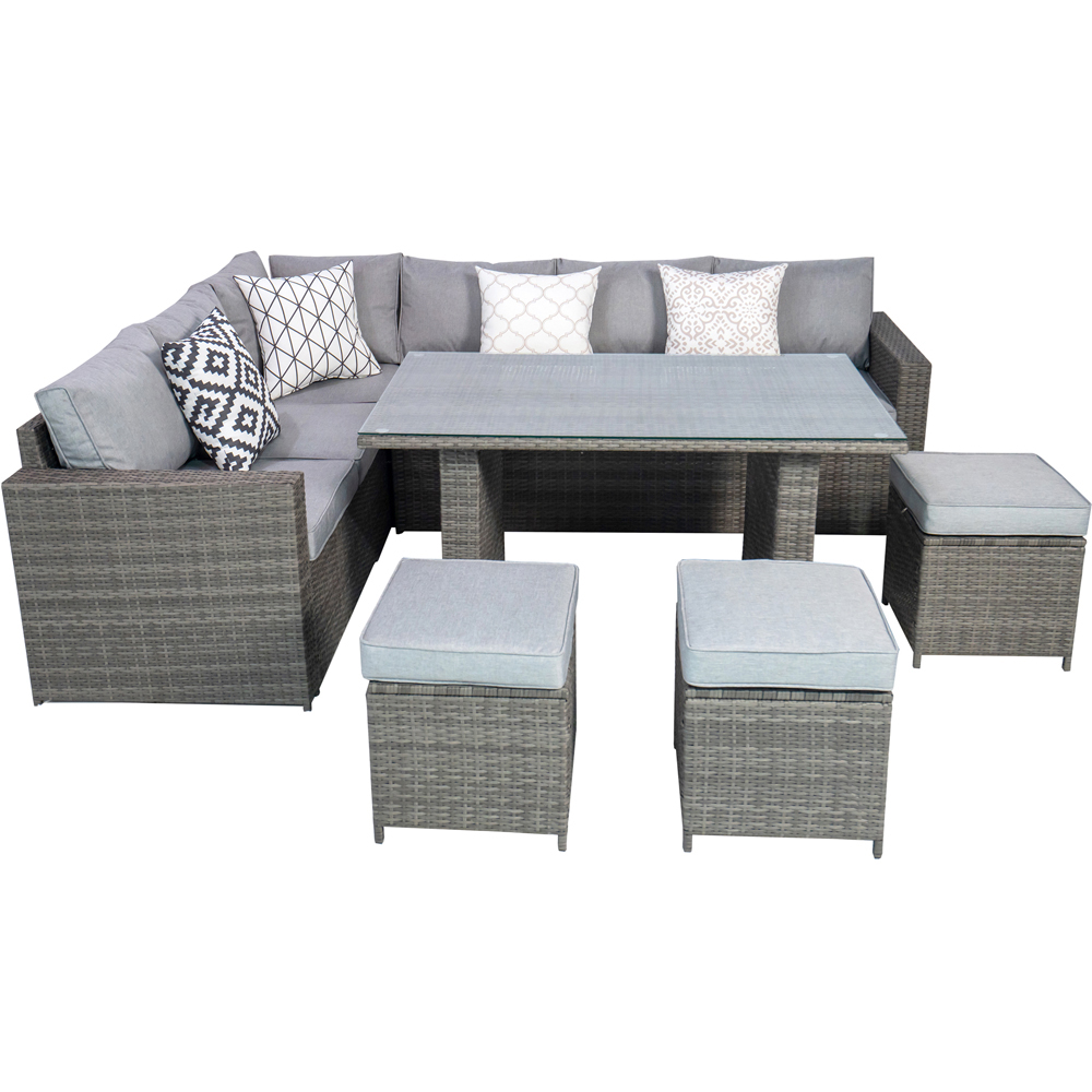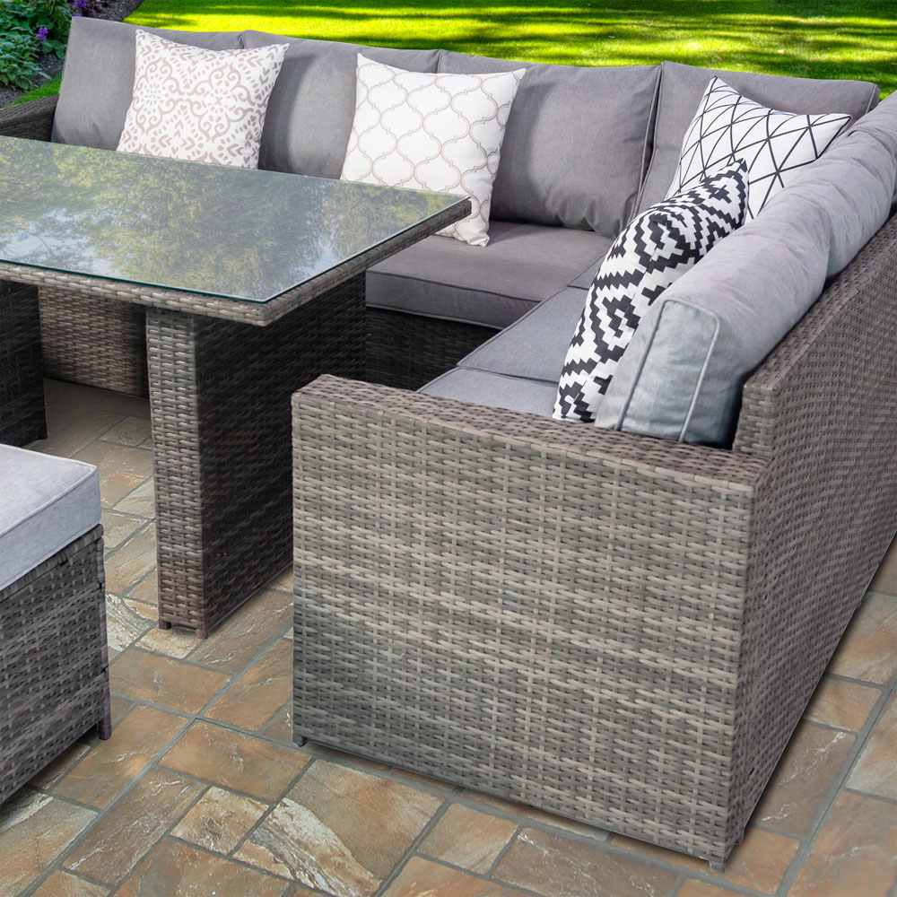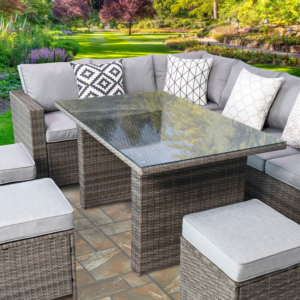 Transform your outdoor space with the Venice rattan garden furniture set, where elegance meets practicality. Perfect for everything from a morning coffee to evening get-togethers, this eight-seater set includes a spacious L-shaped corner sofa, three cosy stools, a high table with a tempered glass top, and four free decorative throw pillows. Made with premium, weather-resistant poly rattan, this set is built to handle all types of weather while maintaining a stylish, sophisticated look. The neutral tones blend effortlessly into any outdoor space, whether it's a large garden or a compact balcony. Designed for easy use and convenience, this set is both lightweight and space-saving, making it easy to rearrange and clean. A simple wipe-down keeps it looking fresh all year long, so it can be enjoyed without the hassle. The bonus throw pillows add an extra layer of comfort and style, making this set the ultimate addition to any outdoor space. Whether hosting a BBQ, enjoying the sunshine, or just relaxing under the stars, the Venice set will help make the most of outdoor moments. Delivered on a pallet in two to three working days, kerbside delivery only.