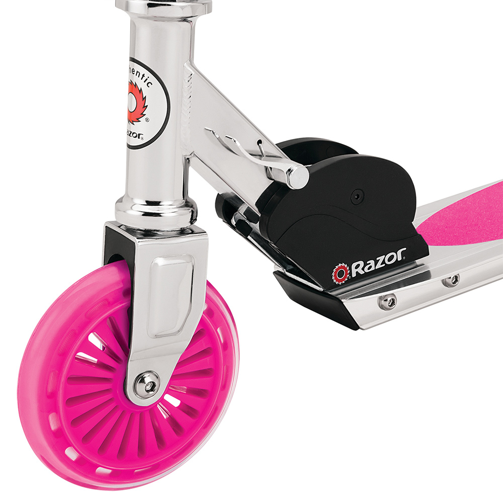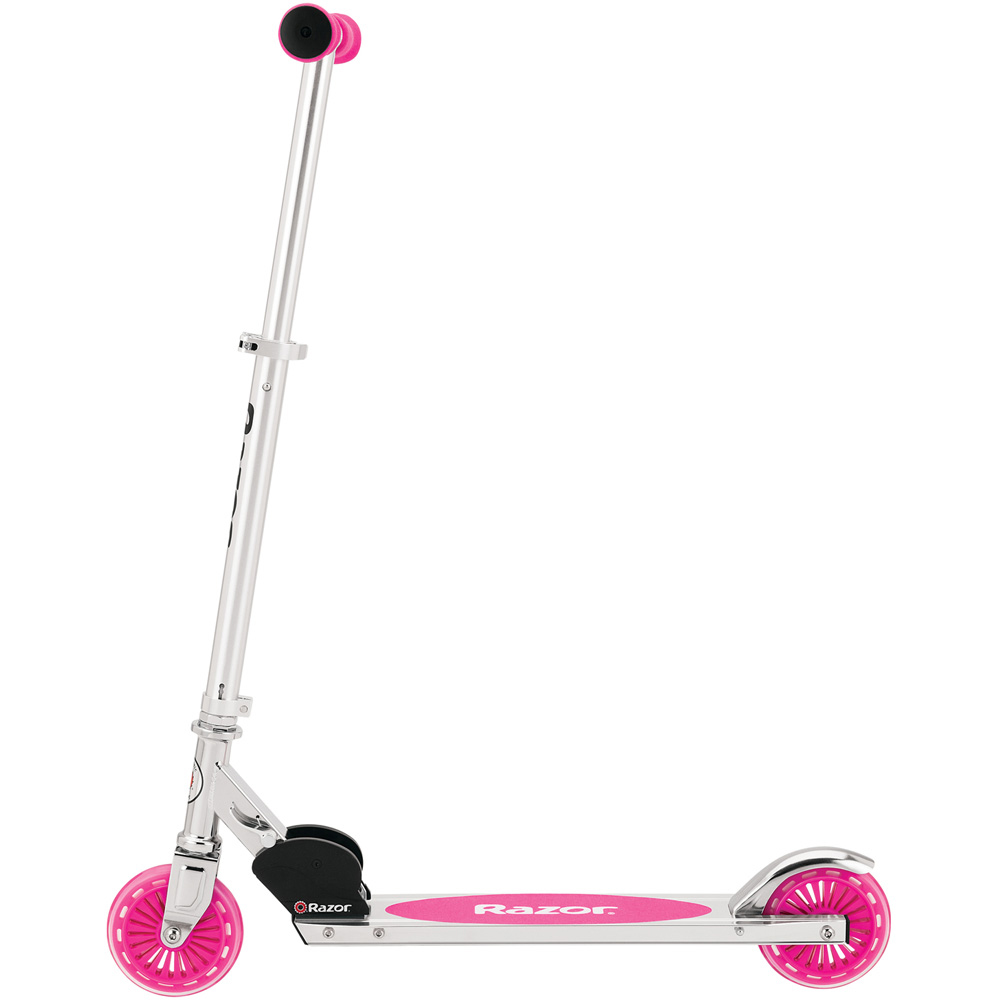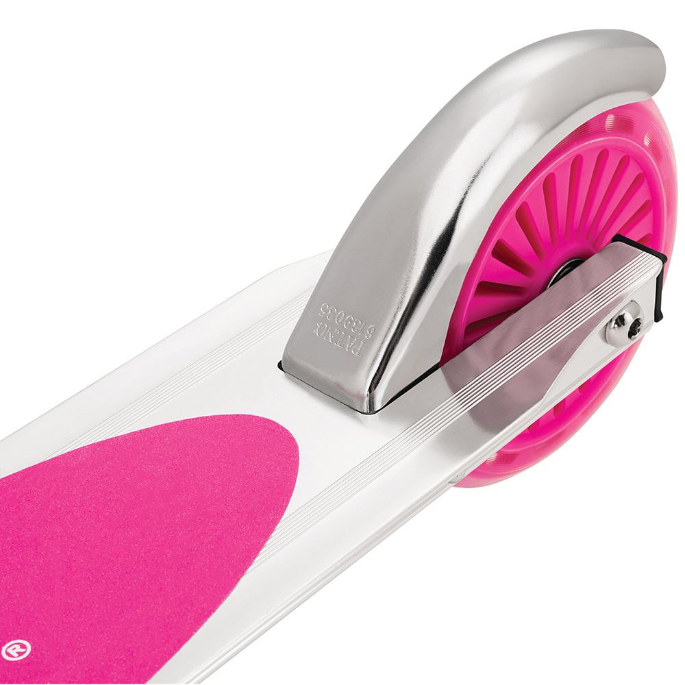 Ride around wherever you want with the Razor A125 Foldable Kick Scooter. This kick scooter is a riff on the iconic A model scooter that Razor has made since 2000. Finished in pink, it features all the elements that made the original Razor scooter a phenomenon, including the patented folding downtube mechanism and an aluminium T-tube and deck. Besides a timeless look and function, this model is GS certified, meaning it meets exacting standards on safety established by the European CE directive and Germany's special requirements. Sturdy and handy, it comes with a high-quality aluminium construction for lightness and durability. Also, the scooter rolls on 120mm wheels for a smooth ride. Easy to use, it has adjustable handlebars with foam grips and a rear fender brake and even requires no assembly, making it ready from the box. The maximum rider weight is 100kg, and the product is suitable for ages six and above.