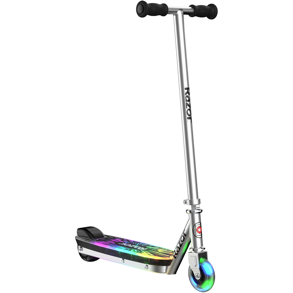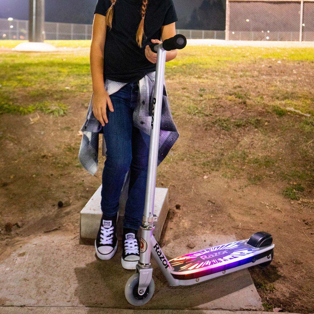 Enjoy an eco-friendly ride with this silver Razor ColorRave Electric Scooter. Step aboard for the excitement, with motorised speeds of up to 7.5 mph (12 km per hour) and up to 30 minutes of continuous ride time. The multi-coloured LED light-up deck and the electric hub motor are activated by the foot-controlled pressure sensor. A simple step on the deck with a slight push gets the rider going, and stopping is just as easy as stepping on the rear fender brake. Suitable for ages eight years and above. Dimensions: 58.5 x 30.5 x 80cm. Weigh 3.92kg. Maximum rider weight is 50kgs.