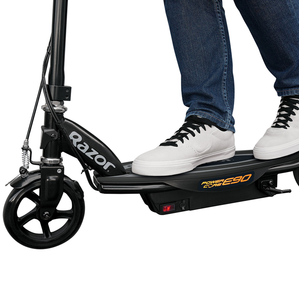 Introduce your little ones to hours of fun with Razor Electric Power Core E90 12 Volt Black Scooter. It rolls out an amazing 65 minutes of continuous ride time and fifty per cent more muscle power. Featuring an innovative hub motor – it delivers a more efficient, maintenance-free ride no alignment, no chain, no belt, while the steel frame, lighter weight and increased torque take performance to the next level. With a max speed of up to 10 mph. It has a push-button accelerator, a hand-operated front brake, a spoked, urethane front wheel with an abrasion-resistant, airless, flat-free tyre at the rear and it also has a retractable kickstand and comes with a 12-volt rechargeable battery and charger. Dimensions: 82.5 x 40.6 x 91.4 cm. Weight: 9.9 kg. Maximum rider weight 54 kg.