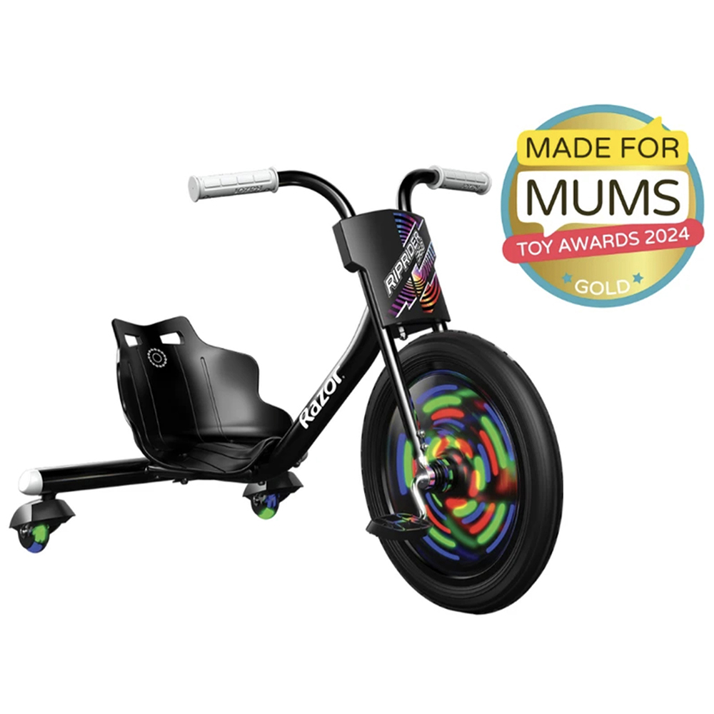 Create a stunning light show with Razor Lightshow 360 RipRider Tricycle. This three-wheeler features over 60 motion-activated, auto-on and off multi-colour LEDs. The dual inclined caster wheels, which also light up, provide countless hours of 360-degree spins, turns, and drifting. Crafted from rugged, welded steel, and the MX-Style handlebar – it has soft rubber grips and double crown fork design. Maximum rider weight 73 kg. Dimensions: 62.2 x 64.8 x 100.3 cm. Weight: 6.80 kg.