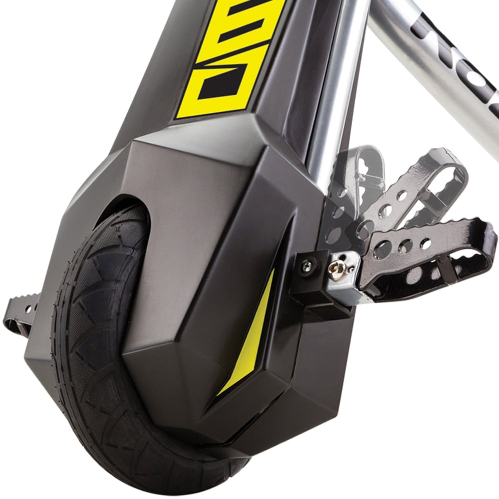 Introduce your little ones to endless fun with Razor PowerRider 360 Electric Powered 12V Black and Yellow 3 Wheeler. It features a chain-driven motor, with push button throttle, front, hand-operated braking system, hi-impact pneumatic front wheel and folding foot pegs for easy entry and exit. With the push of a button, you’re off - no pedalling required. Race at speeds up to 9 mph, cut full 360-degree spins, slide, and even drift on PowerRider 360’s high-performance duel inclined rear caster wheels. With a welded steel frame with a moto-style double crown fork design – it creates a unique look for this electric tricycle with a run time of up to 30 minutes of continuous use. It develops core and neck strength while seated, as well as arm extension and reach while holding the handlebars and operating the hand-powered front brake and comes with a 12-volt rechargeable battery and charger. Dimensions: 68.6 x 25.4 x 63.5 cm. Weight: 14.9 kg. Maximum user weight of 54 kg.