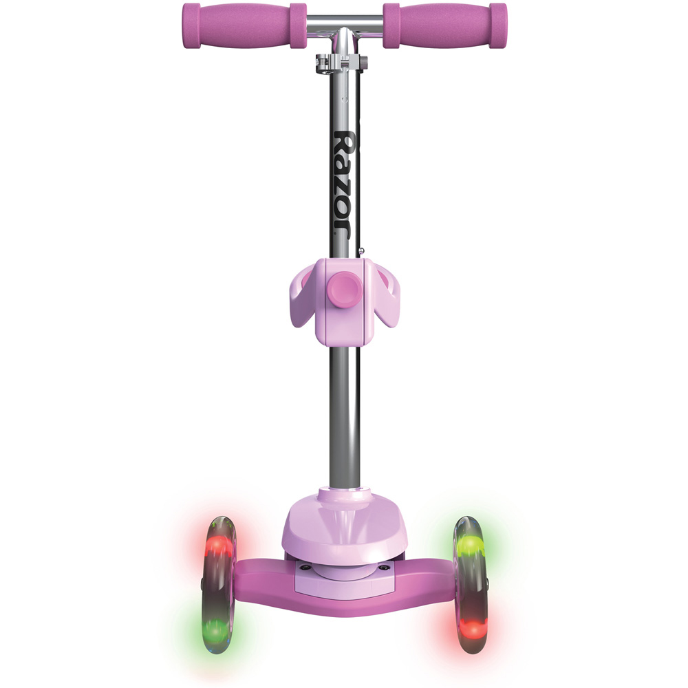 Enjoy a fun ride with this pink Razor Rollie 2-in-1 Scooter. It is perfect for younger children and first-time riders learning to balance and steer. Easy to turn – thanks to the tilt-to-turn steering and hard to tip over. This 2-in-1 convertible scooter can be ridden with a seat or used as a traditional kick scooter by removing the seat, which is also height adjustable. The multi-colour LED lights in the urethane front wheels will illuminate when the scooter is in motion. It also features a polypropylene deck, height-adjustable steel handlebars with foam grips and a wide, urethane rear wheel with a rear fender brake – for stand-up riding. Suitable for ages 2.5 to four years. Maximum rider weight 19.5kg. Dimensions: 55.5 x 29 x 70cm.