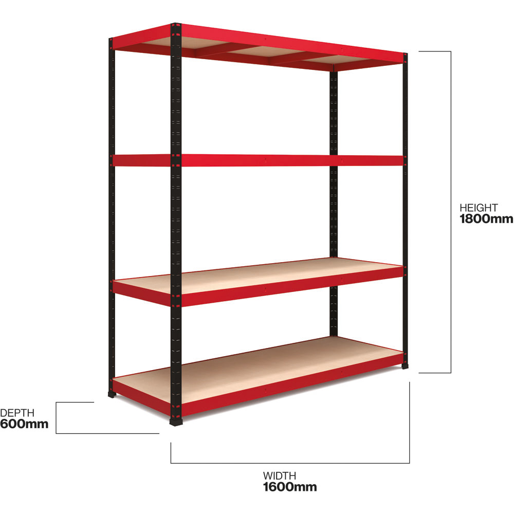 This premium RB Boss FastLok Freestanding Unit can hold up to 300kg per shelf. The unit, with red and black powder-coated steel construction and robust medium-density fibreboard, is ideal for all your storage needs. It is robust and versatile and can be used effectively in a wide variety of environments, such as sheds, utility rooms, garages and workshops even offices and home environments. To ensure an easy setup process, this RB Boss Shelving Unit is completely boltless, meaning you can have your brand new storage solution setup within minutes and not have to worry about any of the different tools and small parts that usually come with the assembly process of similar units. With four heavy-duty shelving tiers, this RB Boss Shelving Unit offers a large shelf area to provide plenty of storage space. The heavy-duty steel construction of the unit’s frame, in combination with the sturdy medium-density fibreboard, offers a high weight load capacity. The RB Boss range is truly the be-all and end-all of Freestanding Shelving Units. This red and black powder-coated boltless shelving unit has four MDF shelves with a uniformly distributed load of 300kg per shelf. Important: If using in a damp environment, it is advised to protect the boards with a moisture-resistant sealant, varnish or paint. Please note that images are for illustration purposes only, and scale may not represent the dimensions of the actual model. Please refer to the product dimensions before ordering.