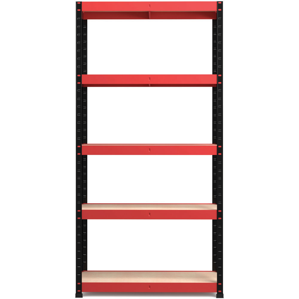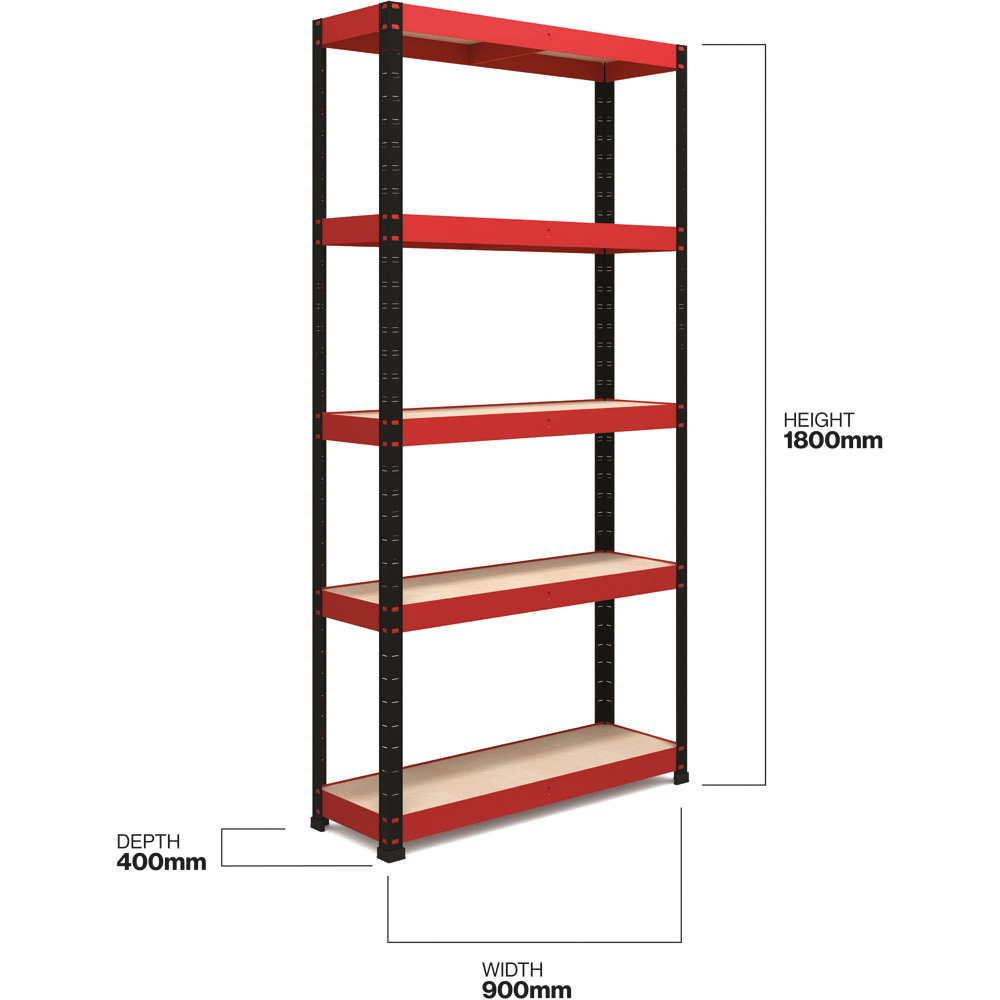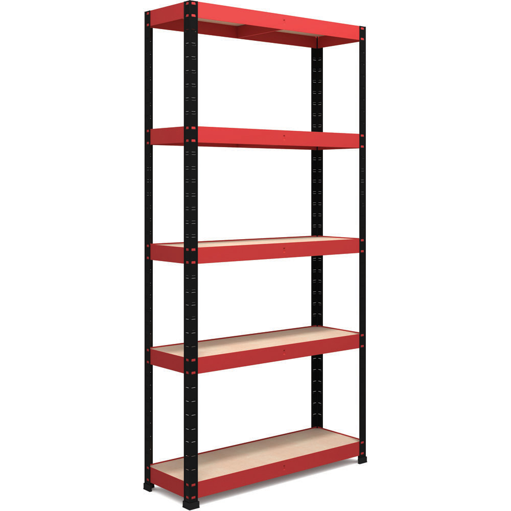 This premium RB Boss FastLok Freestanding Unit can hold up to 250kg per shelf. The unit, with red and black powder-coated steel construction and robust medium-density fibreboard, is ideal for all your storage needs. It is robust and versatile and can be used effectively in a large variety of environments, such as sheds, utility rooms, garages and workshops even offices and home environments. To ensure an easy setup process, this RB Boss Shelving Unit is completely boltless, meaning you can have your brand new storage solution setup within minutes and not have to worry about any of the different tools and small parts that usually come with the assembly process of similar units. With five heavy-duty shelving tiers, this RB Boss Shelving Unit offers a large shelf area to provide plenty of storage space. The heavy-duty steel construction of the unit’s frame, in combination with the sturdy medium-density fibreboard, offers a high weight load capacity. The RB Boss range is truly the be-all and end-all of Freestanding Shelving Units. This red and black powder-coated boltless shelving unit has five MDF shelves with a uniformly distributed load of 250kg per shelf. Important: If using in a damp environment, it is advised to protect the boards with a moisture-resistant sealant, varnish or paint. Please note that images are for illustration purposes only, and scale may not represent the dimensions of the actual model. Please refer to the product dimensions before ordering.