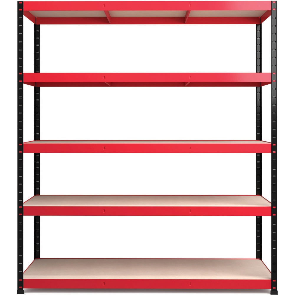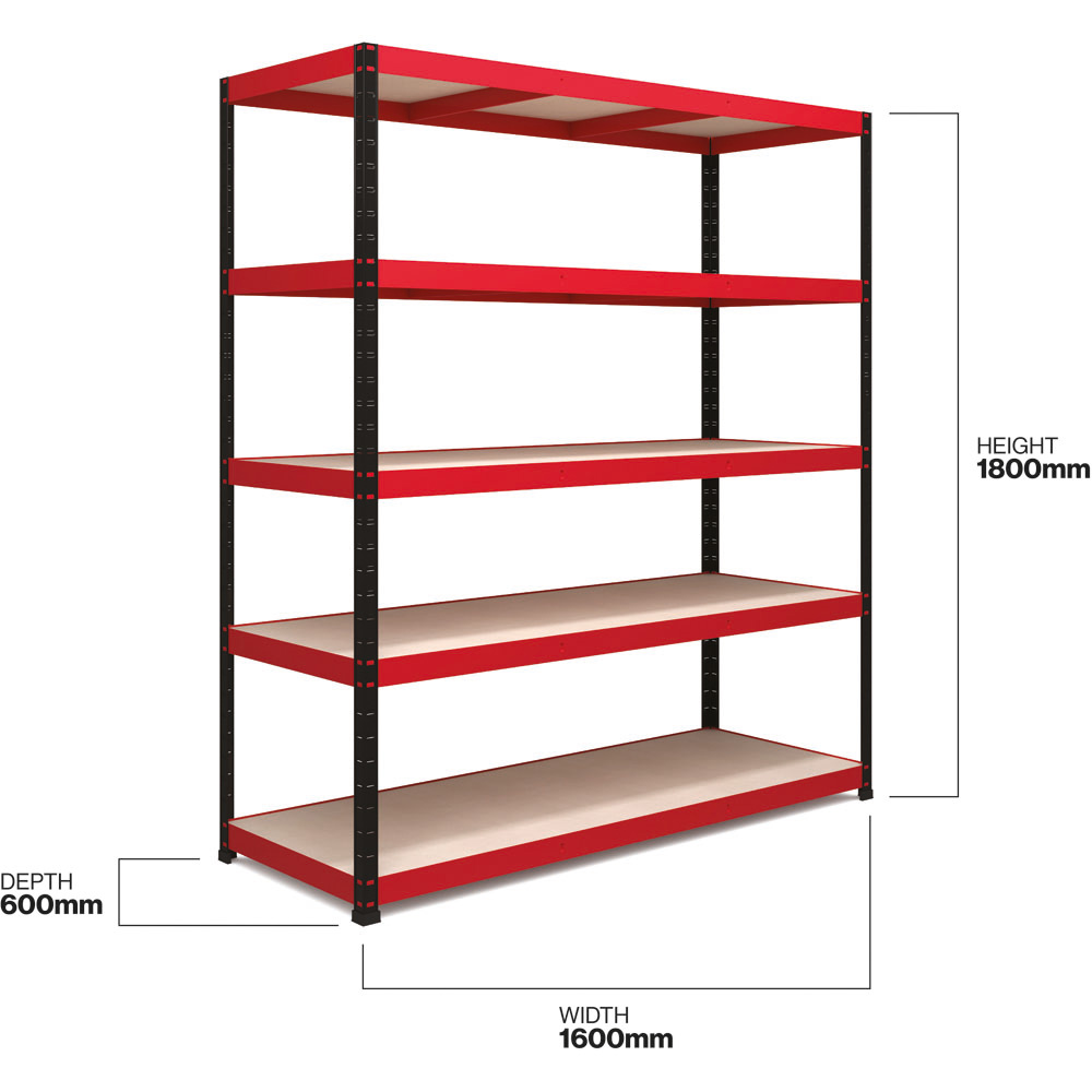This premium RB Boss FastLok Freestanding Unit can hold up to 250kg per shelf. The unit, with red and black powder-coated steel construction and robust medium-density fibreboard, is ideal for all your storage needs. It is robust and versatile and can be used effectively in a large variety of environments, such as sheds, utility rooms, garages and workshops even offices and home environments. To ensure an easy setup process, this RB Boss Shelving Unit is completely boltless, meaning you can have your brand new storage solution setup within minutes and not have to worry about any of the different tools and small parts that usually come with the assembly process of similar units. With five heavy-duty shelving tiers, this RB Boss Shelving Unit offers a large shelf area to provide plenty of storage space. The heavy-duty steel construction of the unit’s frame, in combination with the sturdy medium-density fibreboard, offers a high weight load capacity. The RB Boss range is truly the be-all and end-all of Freestanding Shelving Units. This red and black powder-coated boltless shelving unit has five MDF shelves with a uniformly distributed load of 250kg per shelf. Important: If using in a damp environment, it is advised to protect the boards with a moisture-resistant sealant, varnish or paint. Please note that images are for illustration purposes only, and scale may not represent the dimensions of the actual model. Please refer to the product dimensions before ordering.