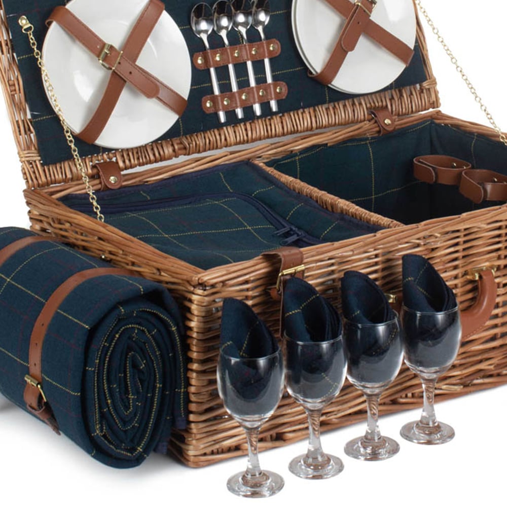The Red Hamper Blue Tweed Fitted Picnic Basket is crafted from light double steamed full willow and features a tan real leather handle. It comes with stainless steel cutlery, a zipped cooler bag, China plates, and a bottle opener. This picnic basket is not only attractive but also of high quality and well-made. It is manufactured from sustainable materials. Its dimensions are 22 x 58 x 38cm.