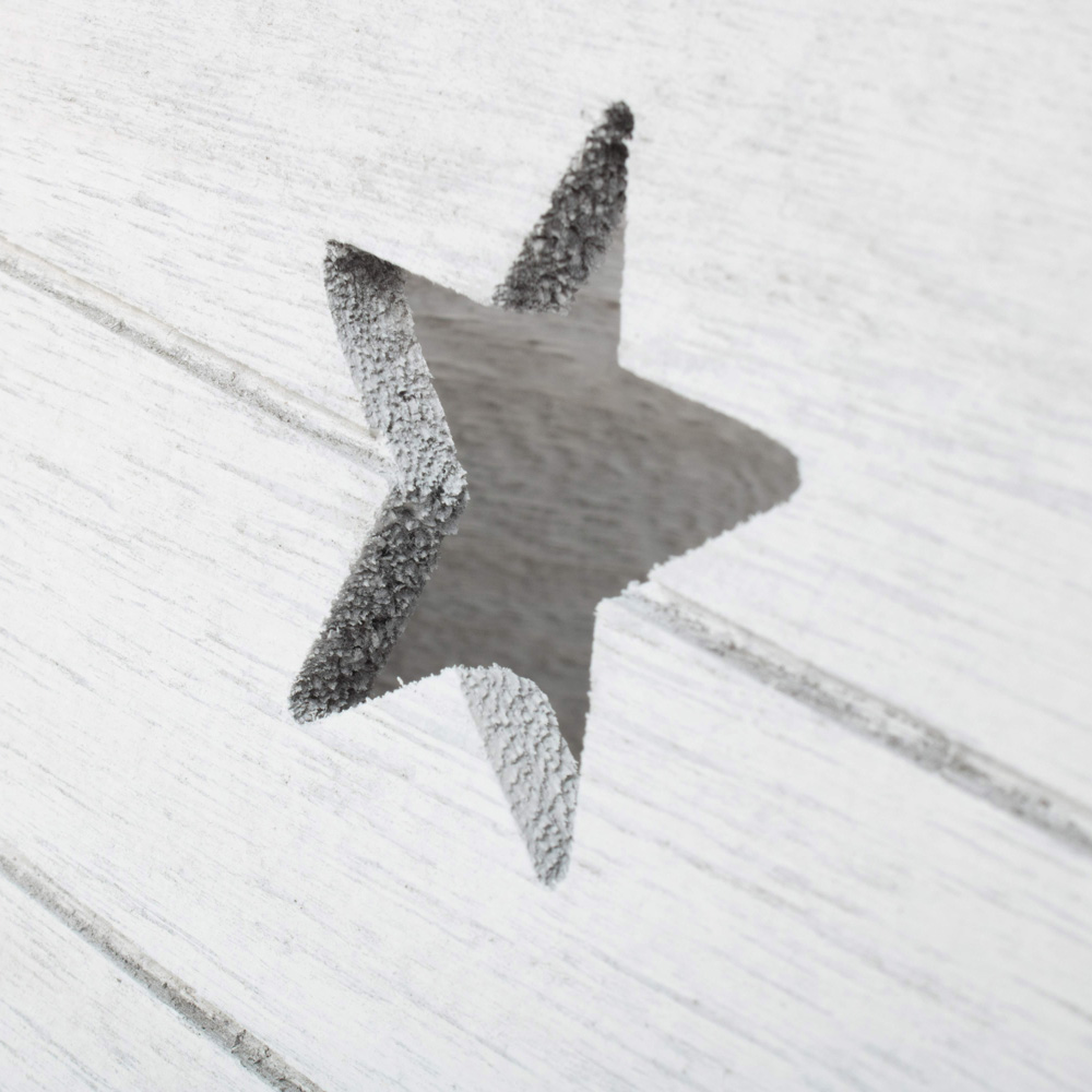 Store your trinkets, bits and bobs in this Red Hamper Large Wooden Vintage Star Cut Out Storage Box. Finished in a whitewashed vintage effect, this softwood storage box looks stylish and features integrated handles for easy use. Also, it is made with high-quality materials for reliable long-term use. Plus, it comes complete with a lid to conceal items stored inside. Size: Large.