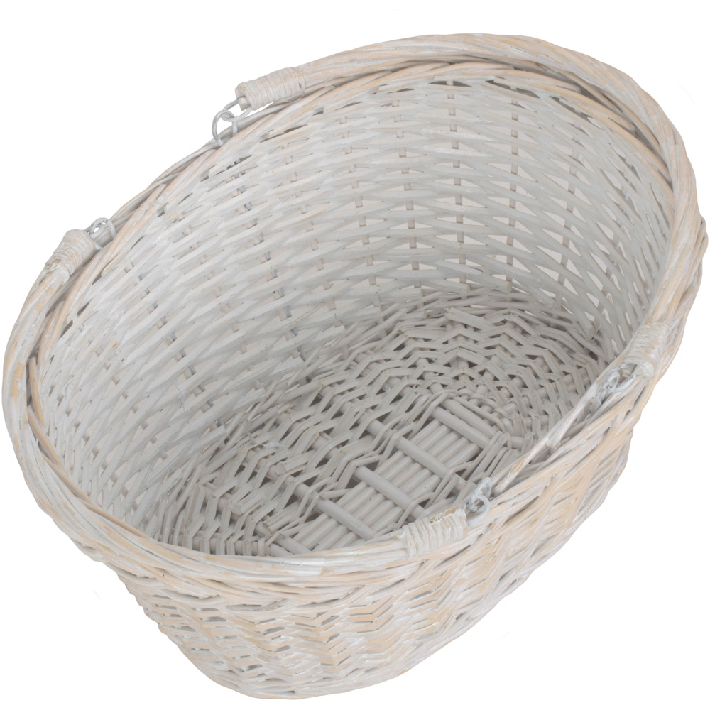 Discover the perfect harmony of functionality and style with this Red Hamper Medium White Swing Handle Wicker Shopping Basket. This lovely basket finished in full and split white painted willow with galvanised metal hoops and swing handles is ideal for around the house storage. The basketware is manufactured from high-quality, sustainable natural materials. Colours, finish and dimensions could vary. Size: H18 x W30 x L41cm.